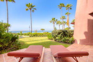 Impeccably renovated, south facing beach front, garden apartment located in the exclusive Menara Beach community on the sought-after New Golden Mile