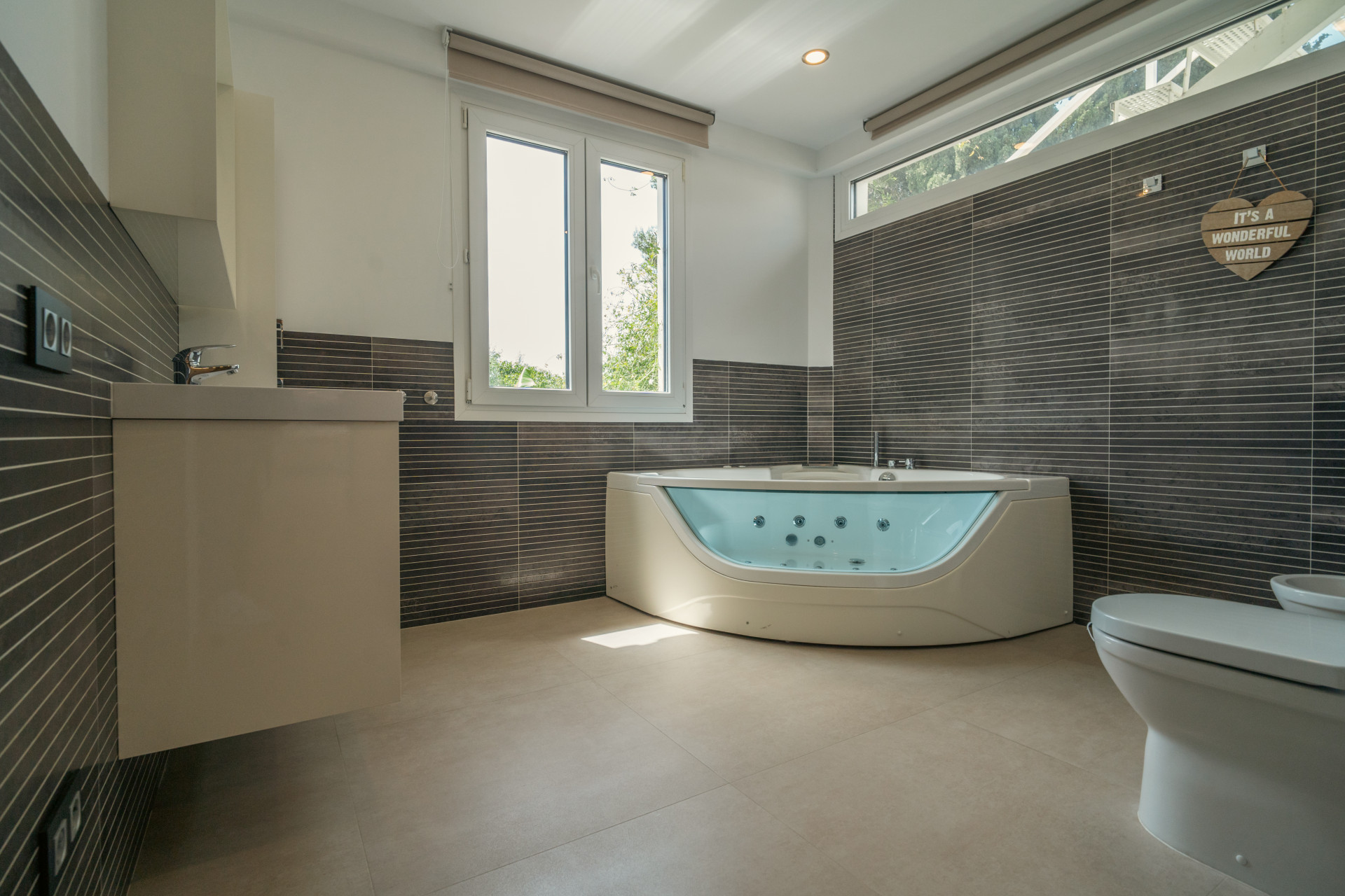 Outside, the villa includes a double garage, ample parking for several vehicles, a low-maintenance garden and a south-facing swimming pool with Roman steps and LED ambient lighting. The property also has approved planning permission for a glazed conservatory and a panoramic terrace with sea and mountain views.
