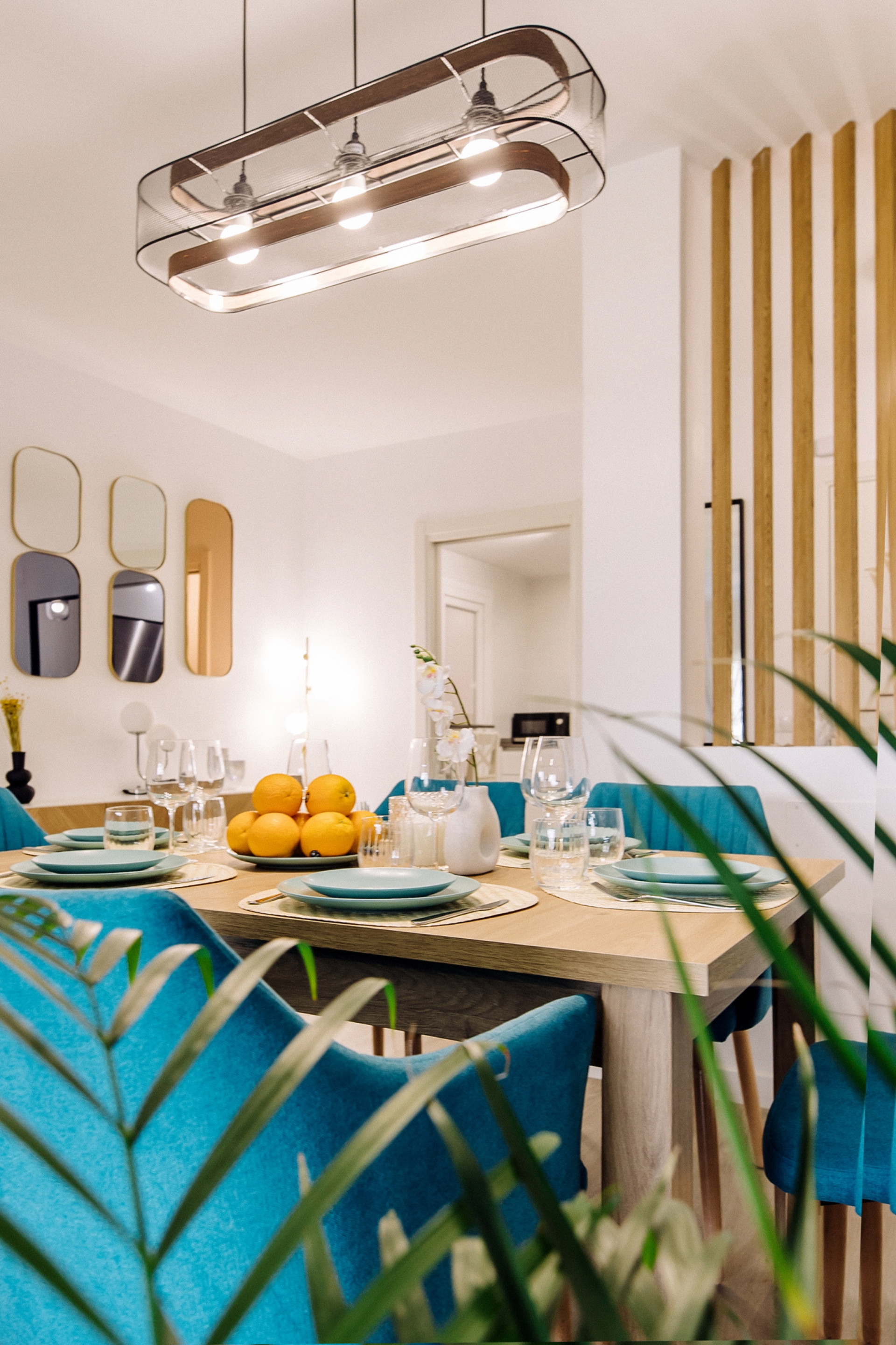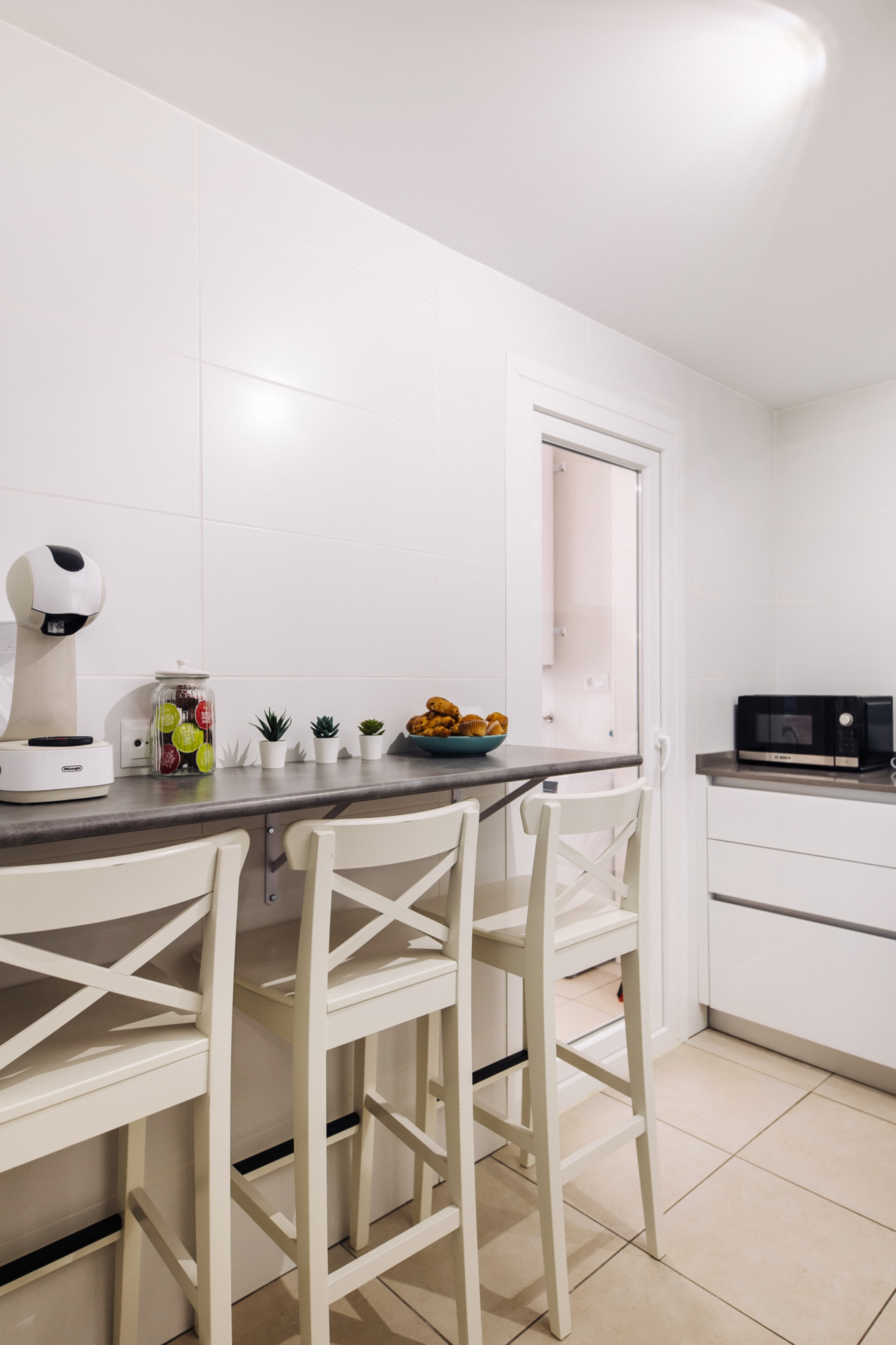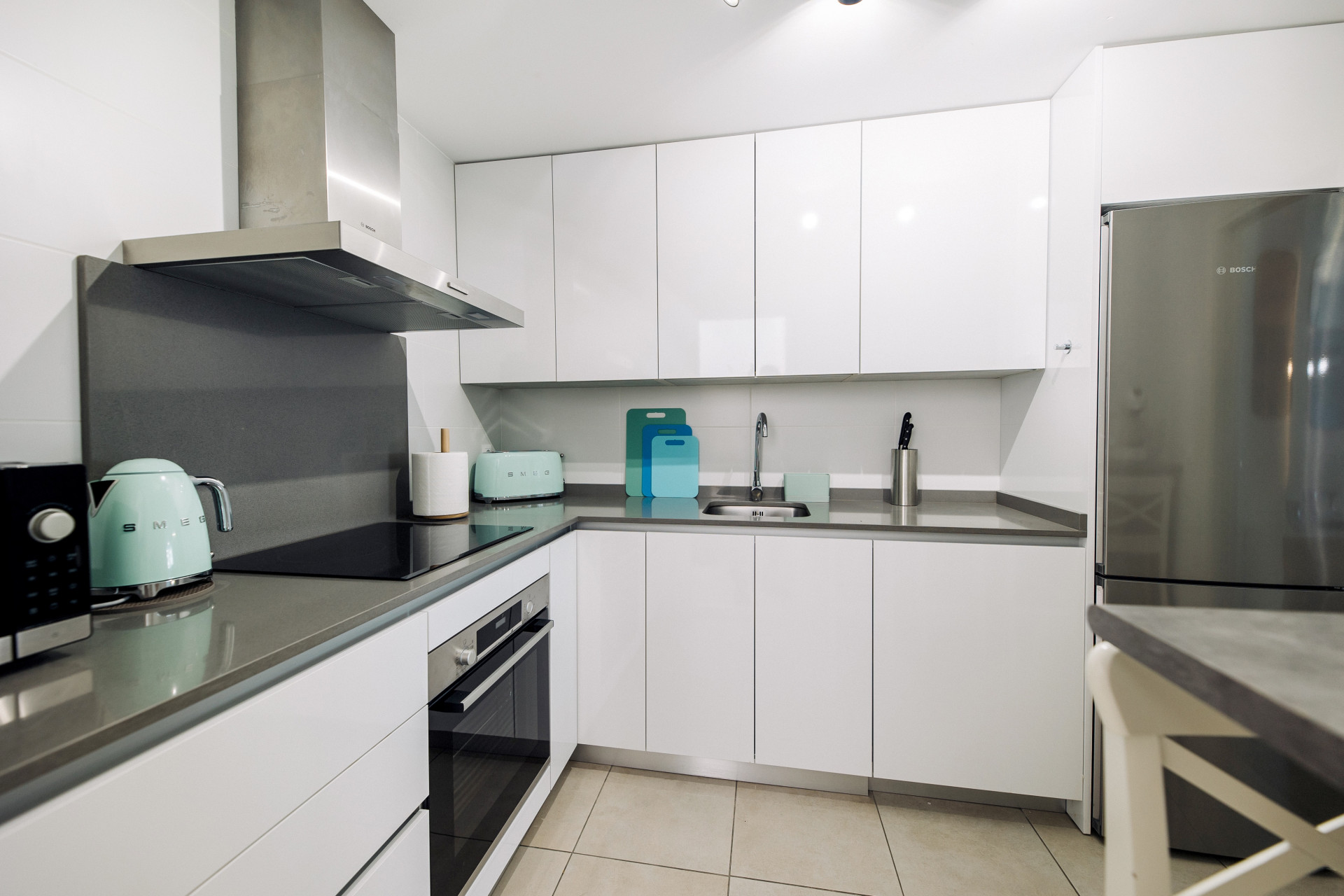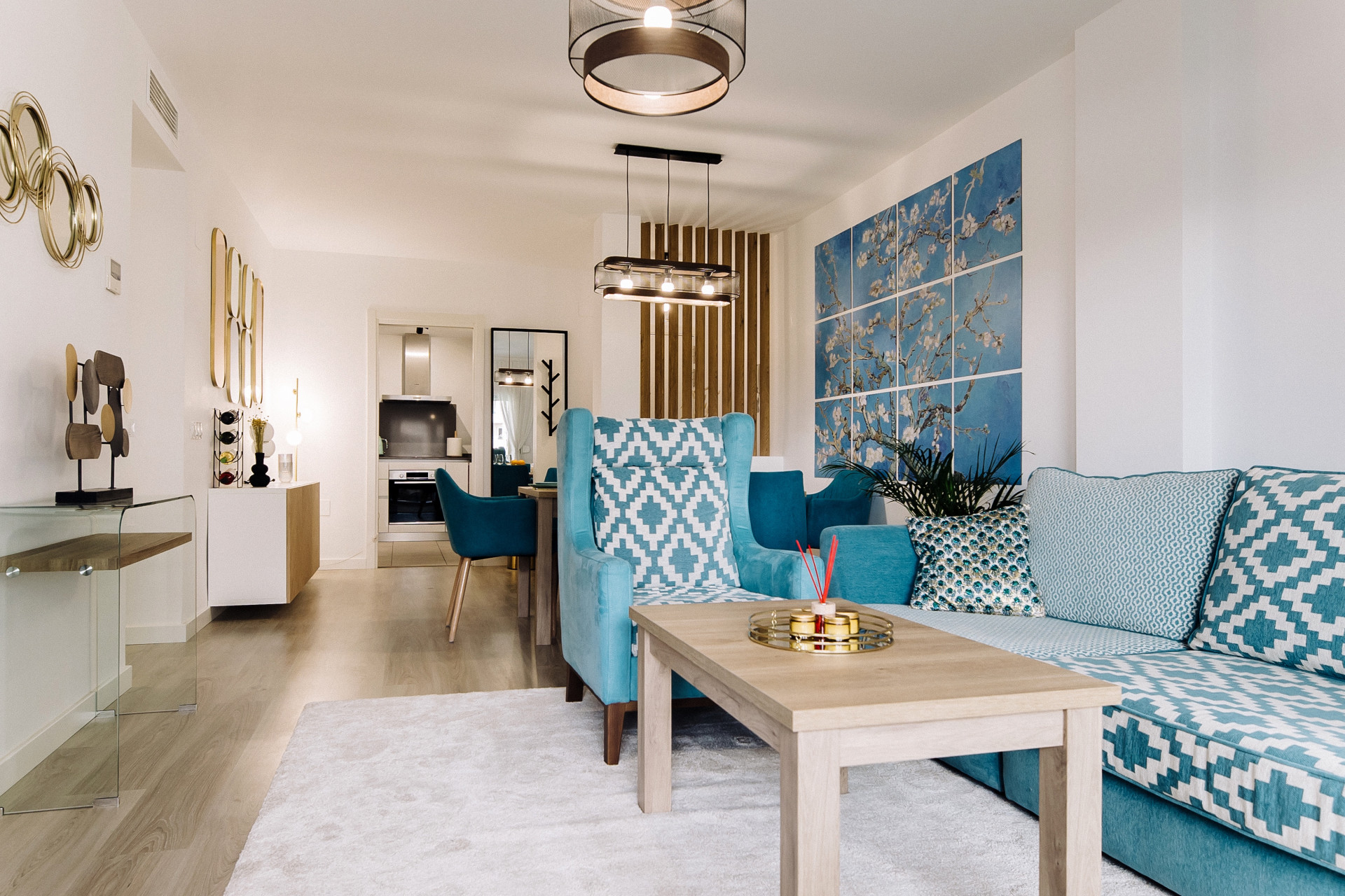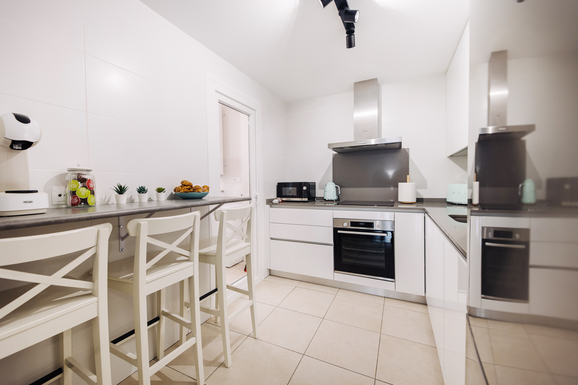 Spanning a generous 90 square metres, the apartment’s thoughtfully designed interior includes a bright and airy living room, a formal dining area, and a fully fitted kitchen equipped with modern appliances, perfect for both daily meals and entertaining. Parquet floors add a touch of elegance to the living spaces, enhanced by large glass doors that lead to a covered terrace. From here, residents can enjoy tranquil garden views, a perfect setting to unwind with a morning coffee or an evening glass of wine while using the high-speed fibre optic internet connection for streaming or work.