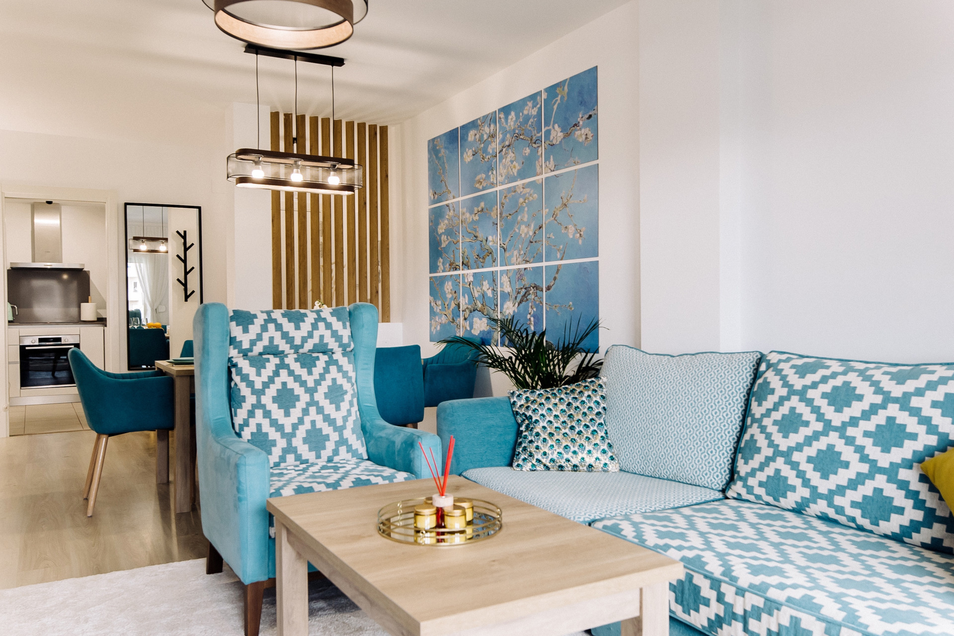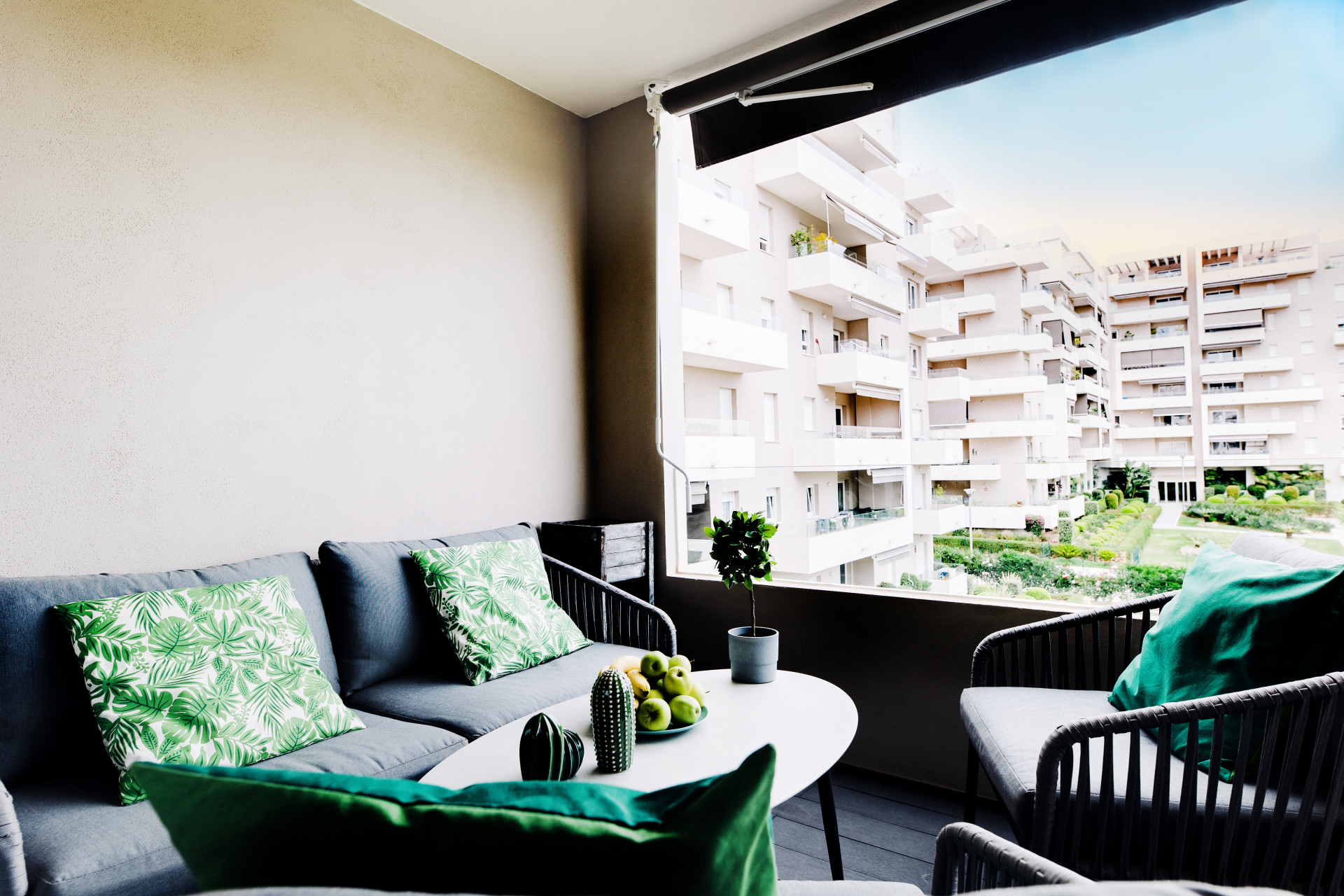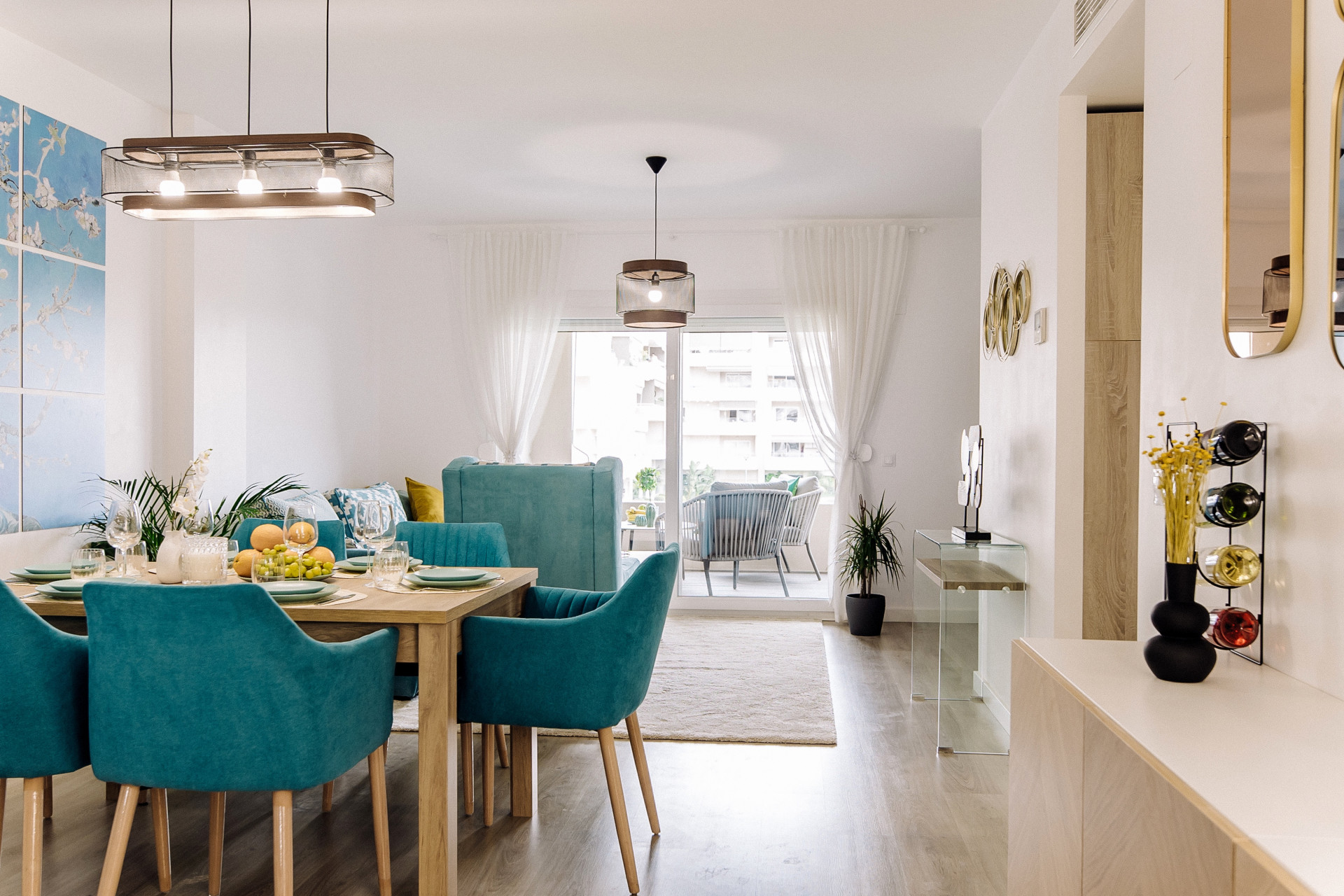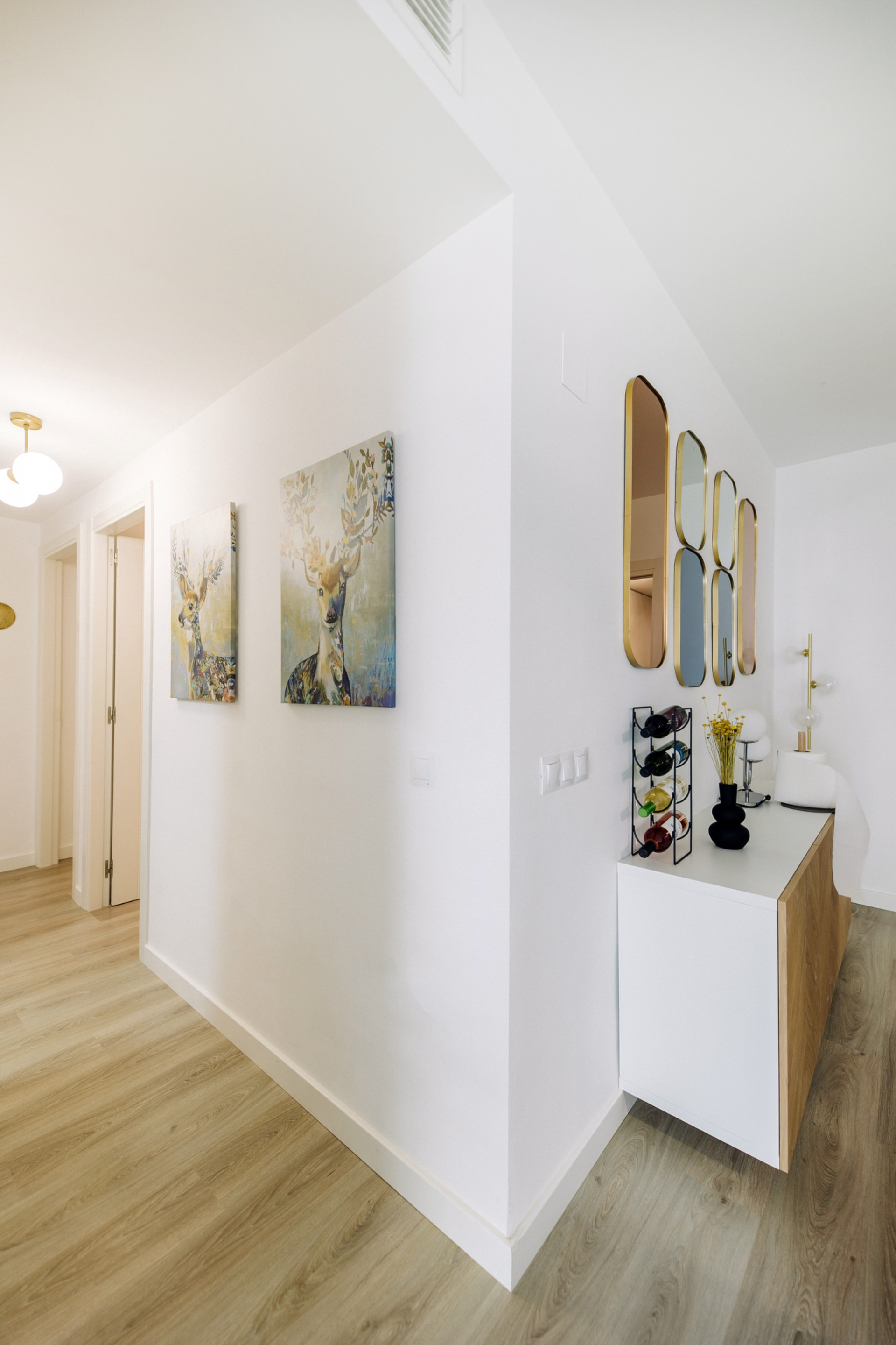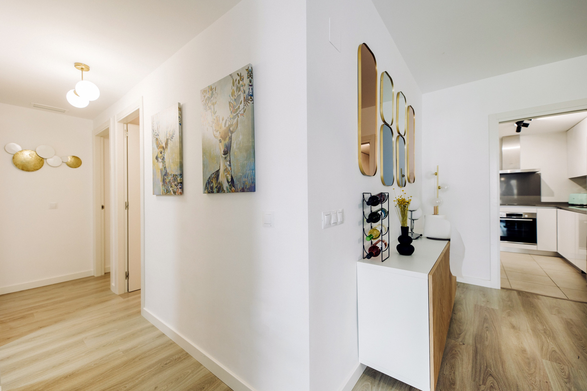 Spanning a generous 90 square metres, the apartment’s thoughtfully designed interior includes a bright and airy living room, a formal dining area, and a fully fitted kitchen equipped with modern appliances, perfect for both daily meals and entertaining. Parquet floors add a touch of elegance to the living spaces, enhanced by large glass doors that lead to a covered terrace. From here, residents can enjoy tranquil garden views, a perfect setting to unwind with a morning coffee or an evening glass of wine while using the high-speed fibre optic internet connection for streaming or work.