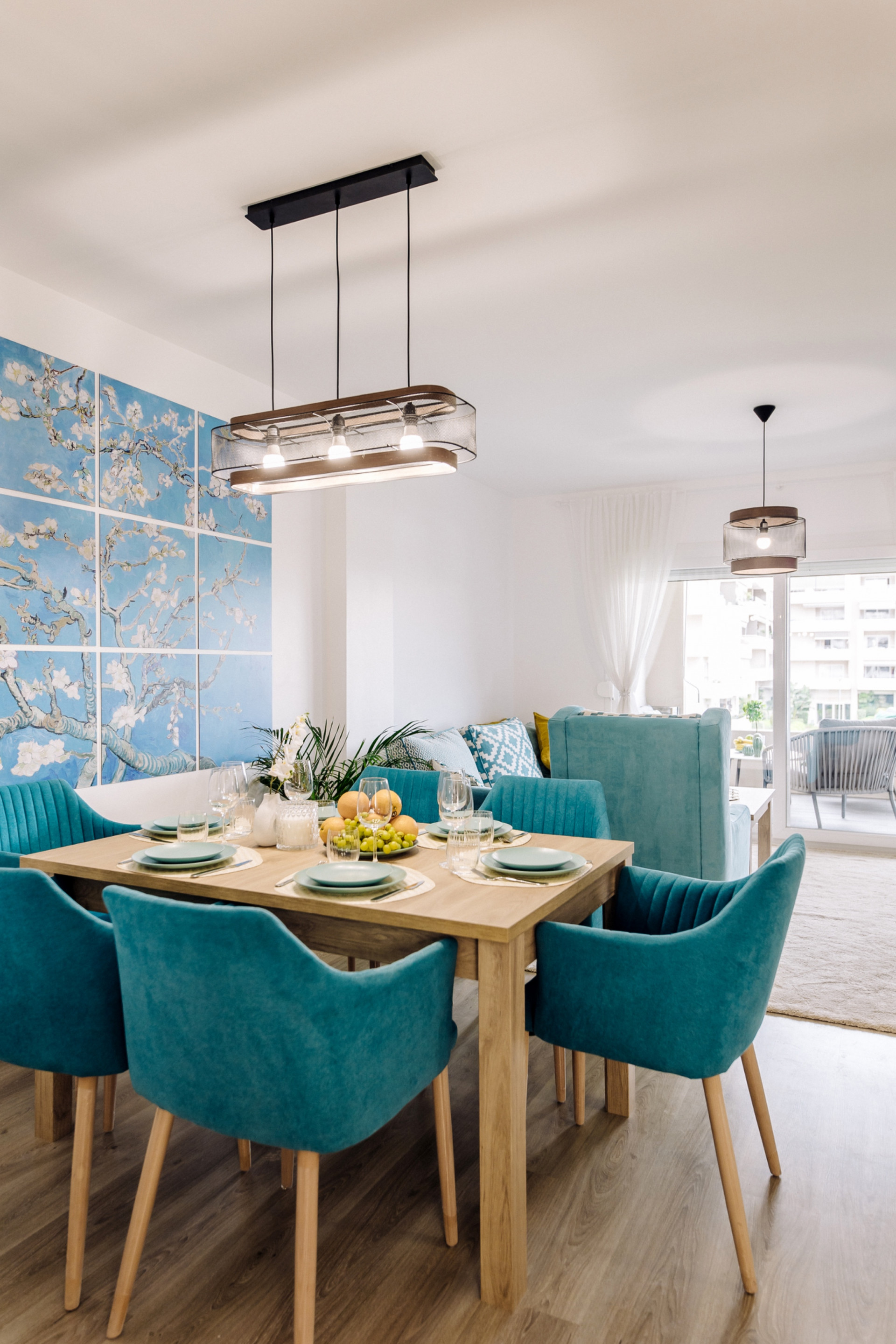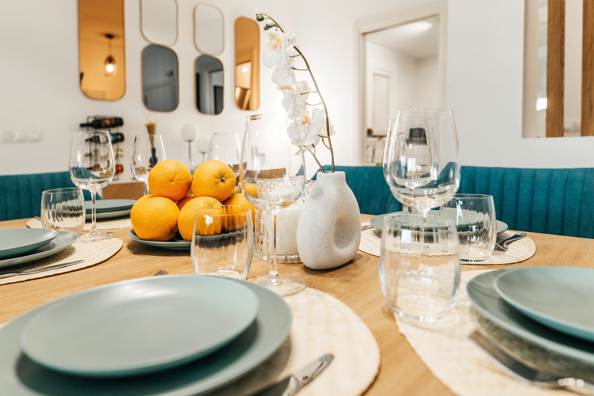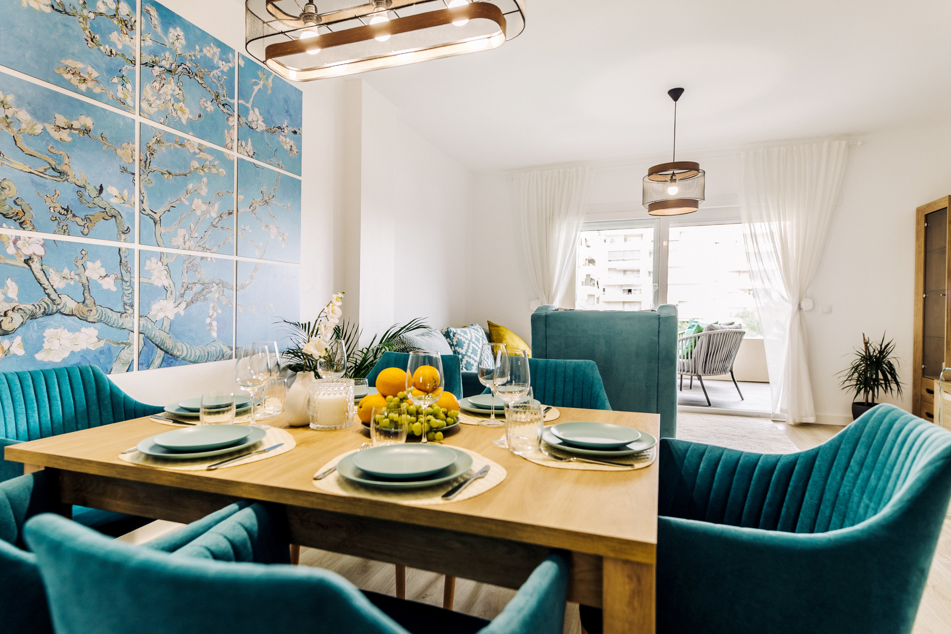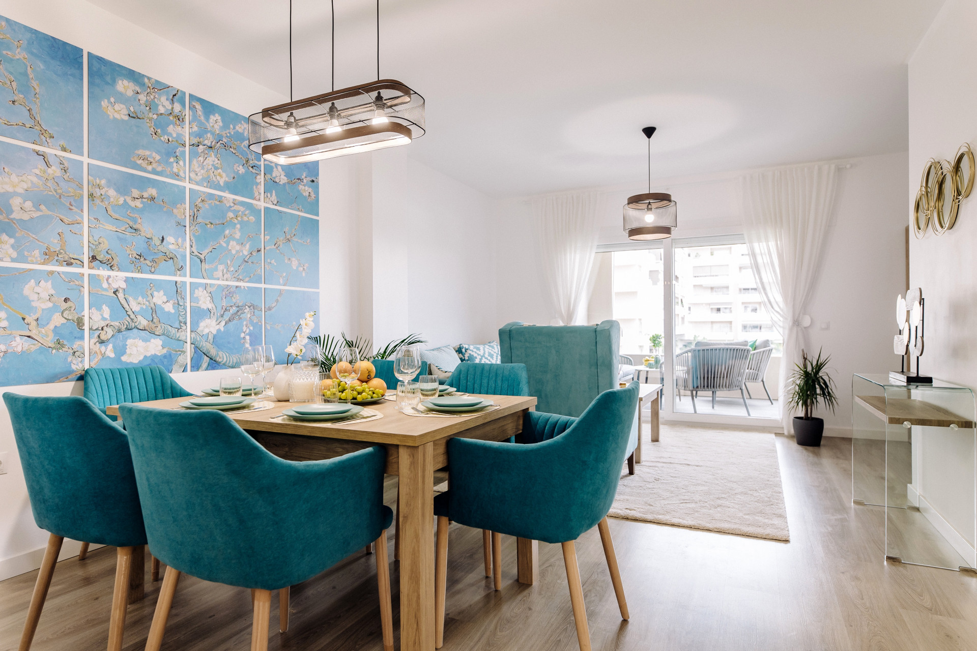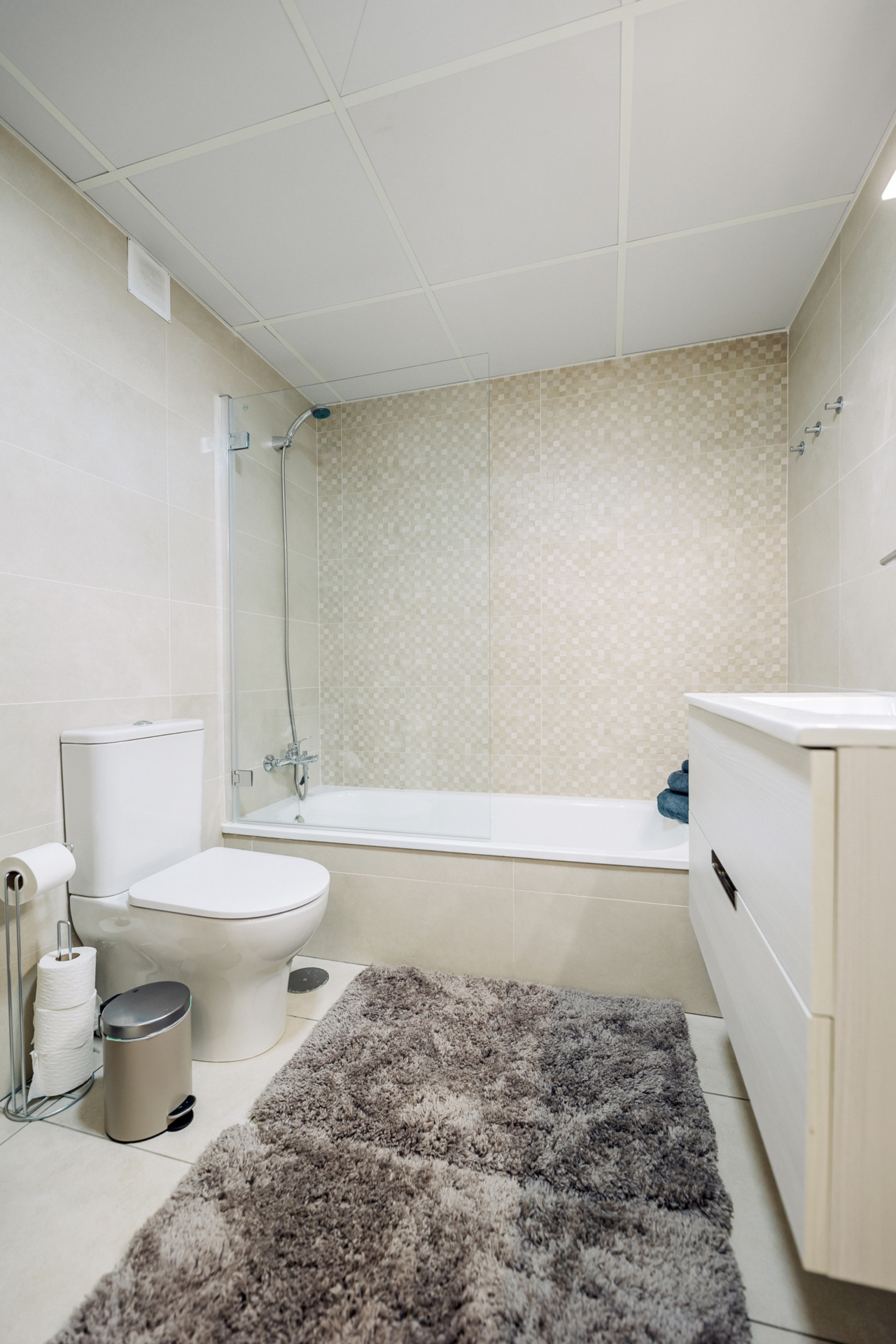 Spanning a generous 90 square metres, the apartment’s thoughtfully designed interior includes a bright and airy living room, a formal dining area, and a fully fitted kitchen equipped with modern appliances, perfect for both daily meals and entertaining. Parquet floors add a touch of elegance to the living spaces, enhanced by large glass doors that lead to a covered terrace. From here, residents can enjoy tranquil garden views, a perfect setting to unwind with a morning coffee or an evening glass of wine while using the high-speed fibre optic internet connection for streaming or work.