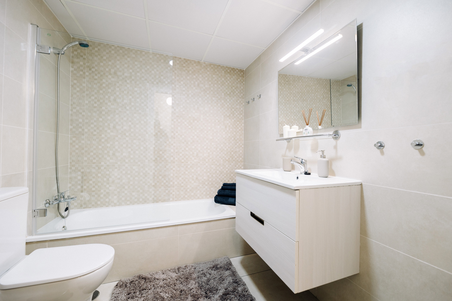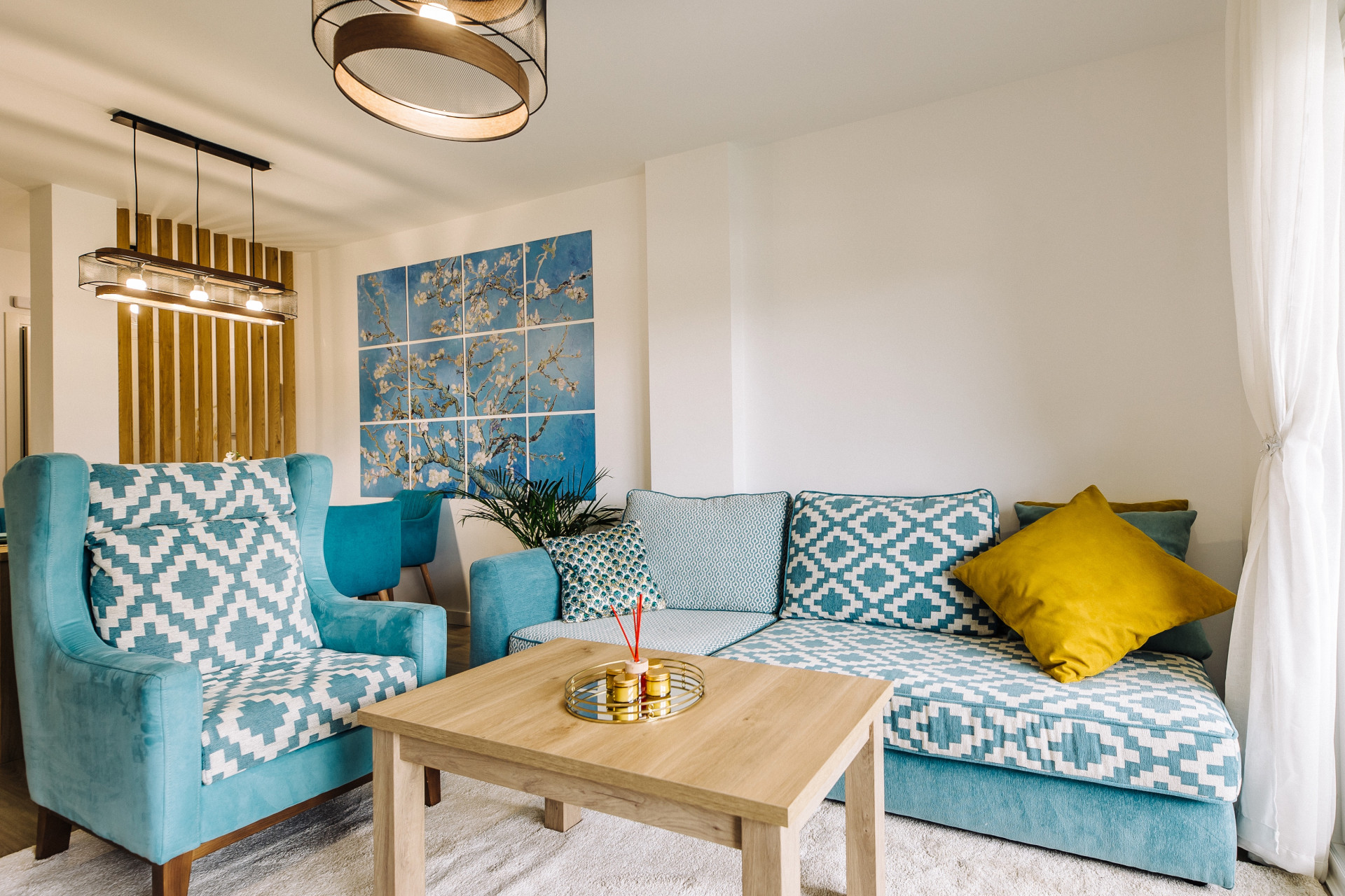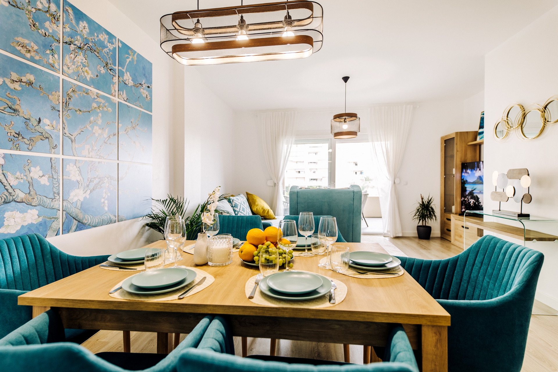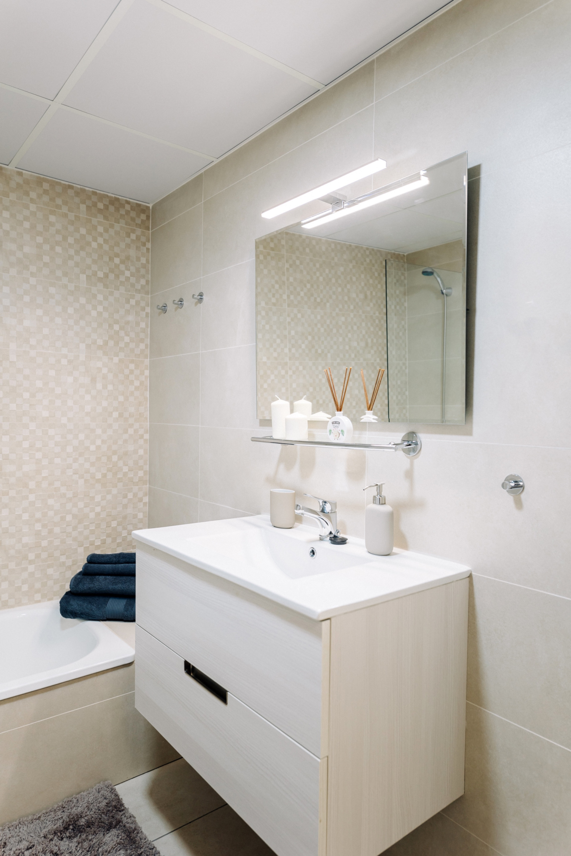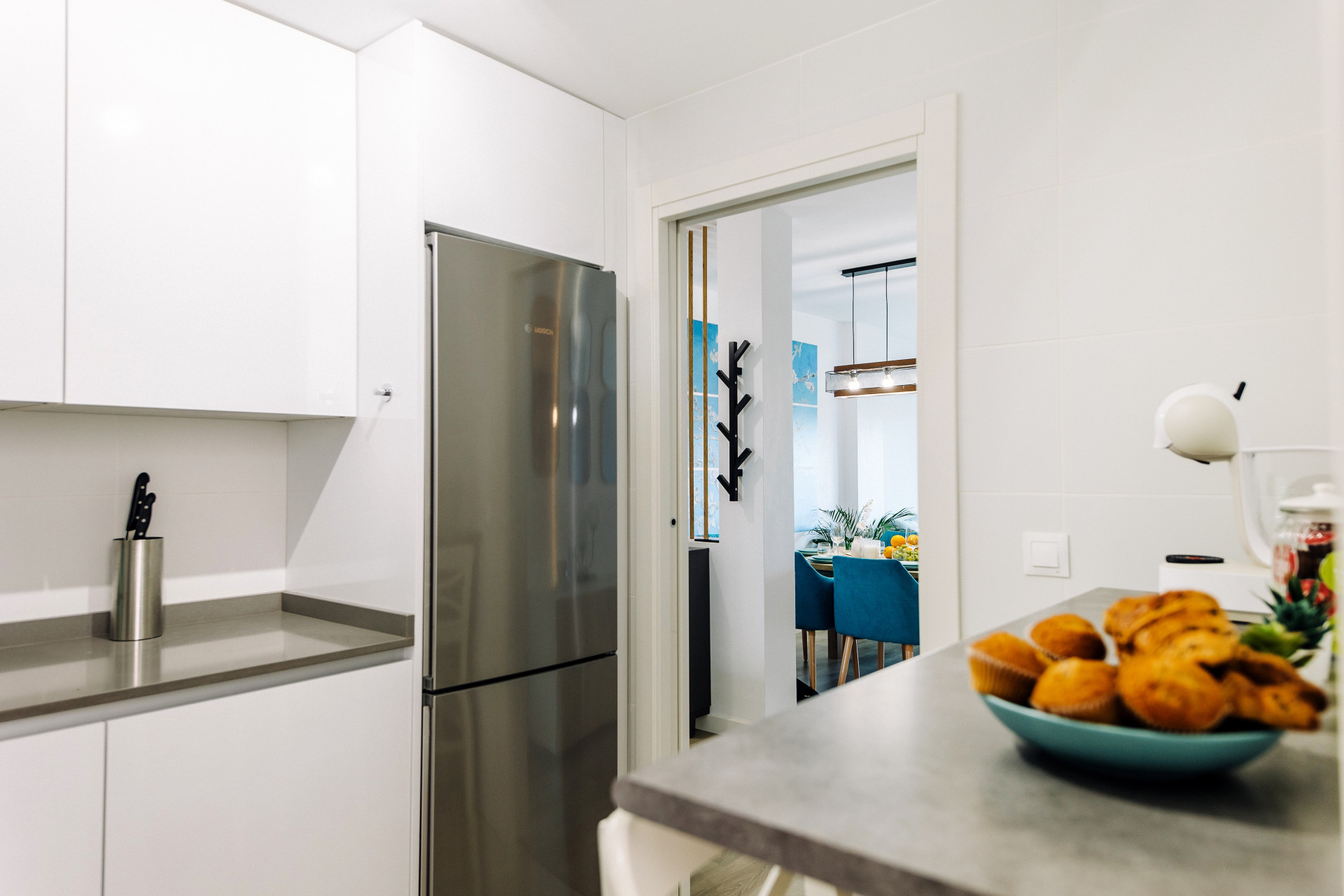 Spanning a generous 90 square metres, the apartment’s thoughtfully designed interior includes a bright and airy living room, a formal dining area, and a fully fitted kitchen equipped with modern appliances, perfect for both daily meals and entertaining. Parquet floors add a touch of elegance to the living spaces, enhanced by large glass doors that lead to a covered terrace. From here, residents can enjoy tranquil garden views, a perfect setting to unwind with a morning coffee or an evening glass of wine while using the high-speed fibre optic internet connection for streaming or work.