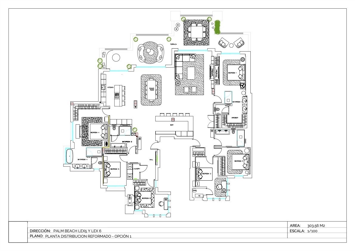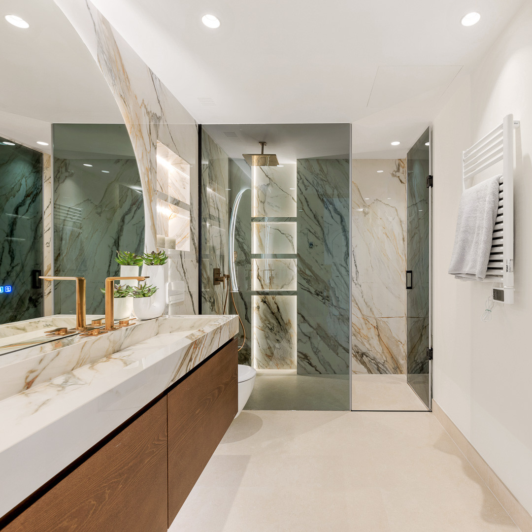 The apartment features a spacious layout with six bedrooms and four bathrooms, including two en-suite, all recently renovated to the highest standards. The open-plan living space comprises a fully fitted and equipped kitchen with modern appliances and a stylish living room with a fireplace and Dolby Stereo Surround system for quality leisure time. Electric blinds, double glazing, and underfloor heating throughout ensure year-round comfort, while additional practicalities include a laundry room, walk-in closet, storage room, and fitted wardrobes.