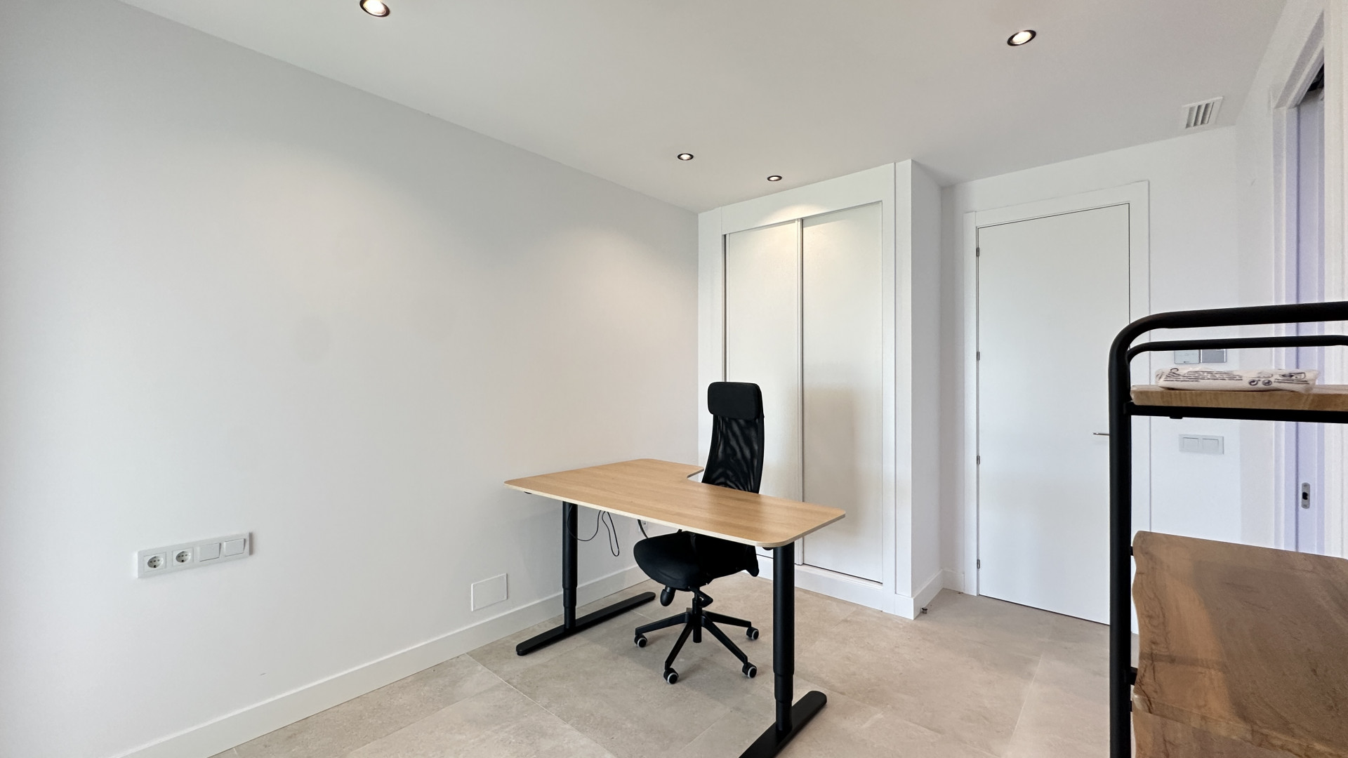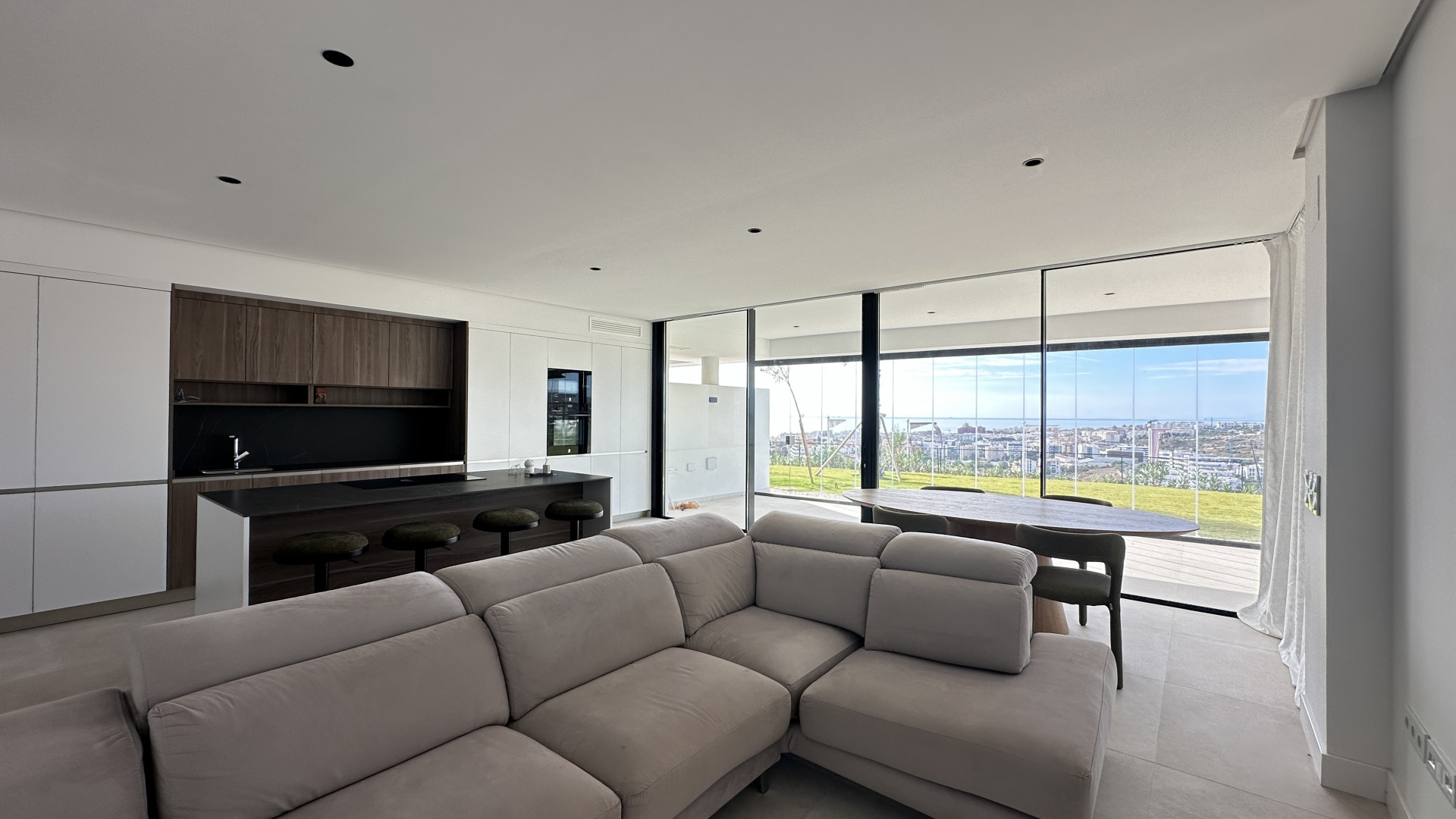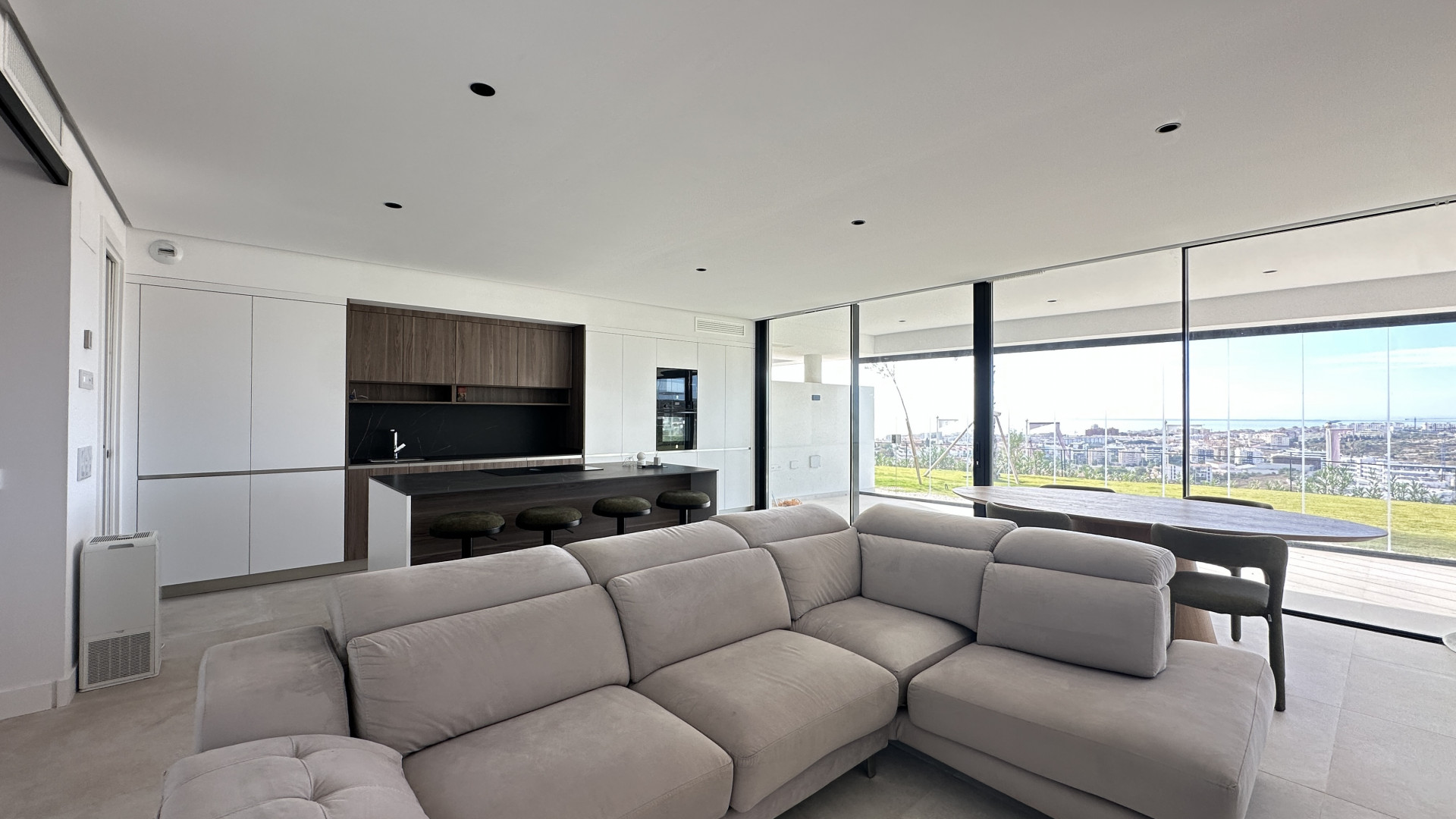 Spanning a generous 149.92m², the apartment features four spacious bedrooms and three stylish bathrooms, including one en-suite. The property is presented in excellent condition, with an open plan kitchen that is both fully fitted and equipped, alongside a dining room and living area that flow seamlessly onto a large private and covered terrace. Large glass doors, combined with double glazing and panoramic windows, ensure sweeping sea and mountain views from many vantage points in the home. High quality Gres floors, underfloor heating throughout, fitted wardrobes, and a walk-in closet add practical convenience and comfort, while security shutters, an armored door, and surveillance cameras provide peace of mind.