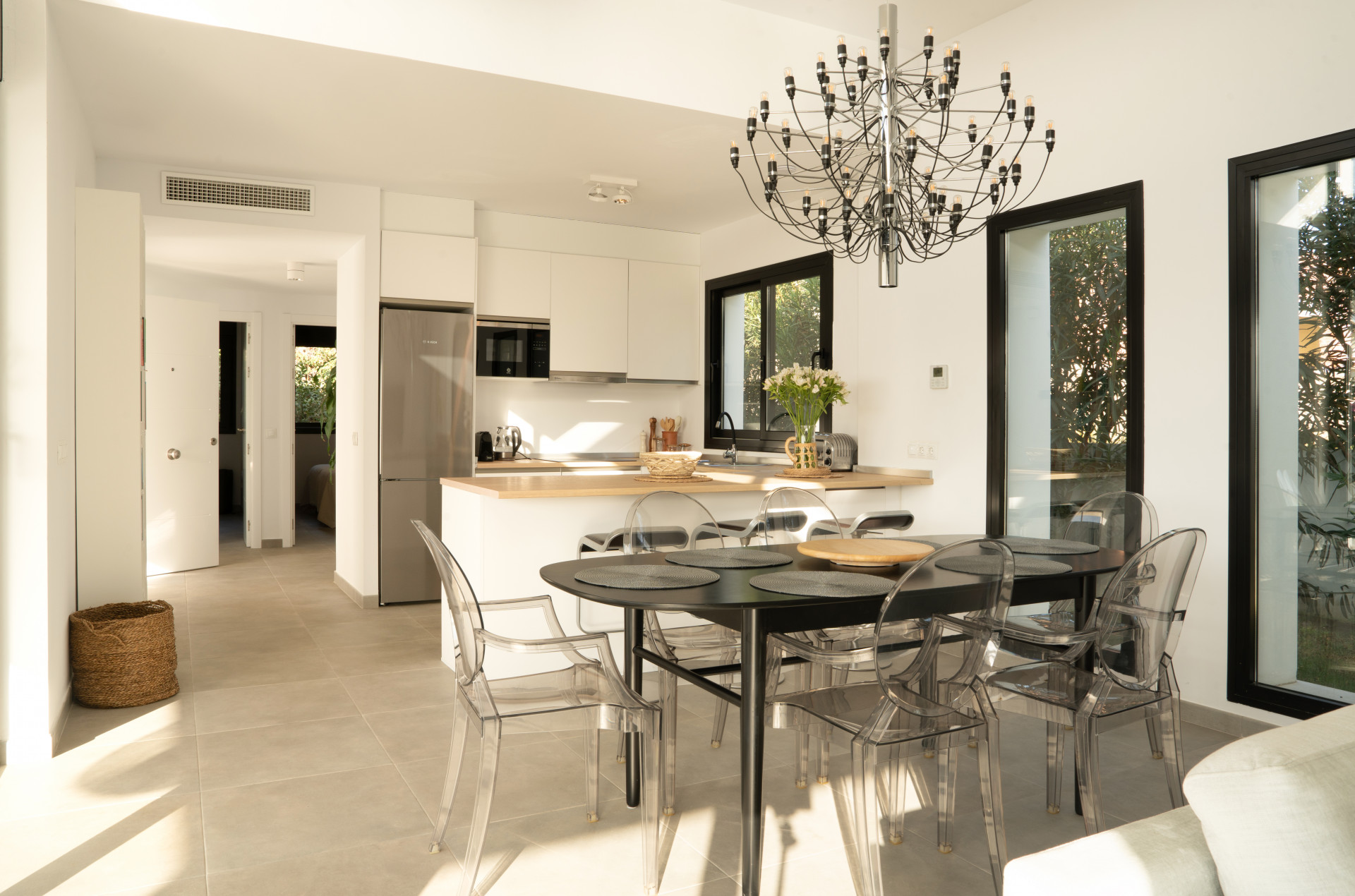 Outside, a private pool and landscaped garden create a relaxed atmosphere, with flowering plants that bring colour throughout the year and give the property a pleasant, spring-like feel. Several terraces provide ideal areas for dining or spending time outdoors.