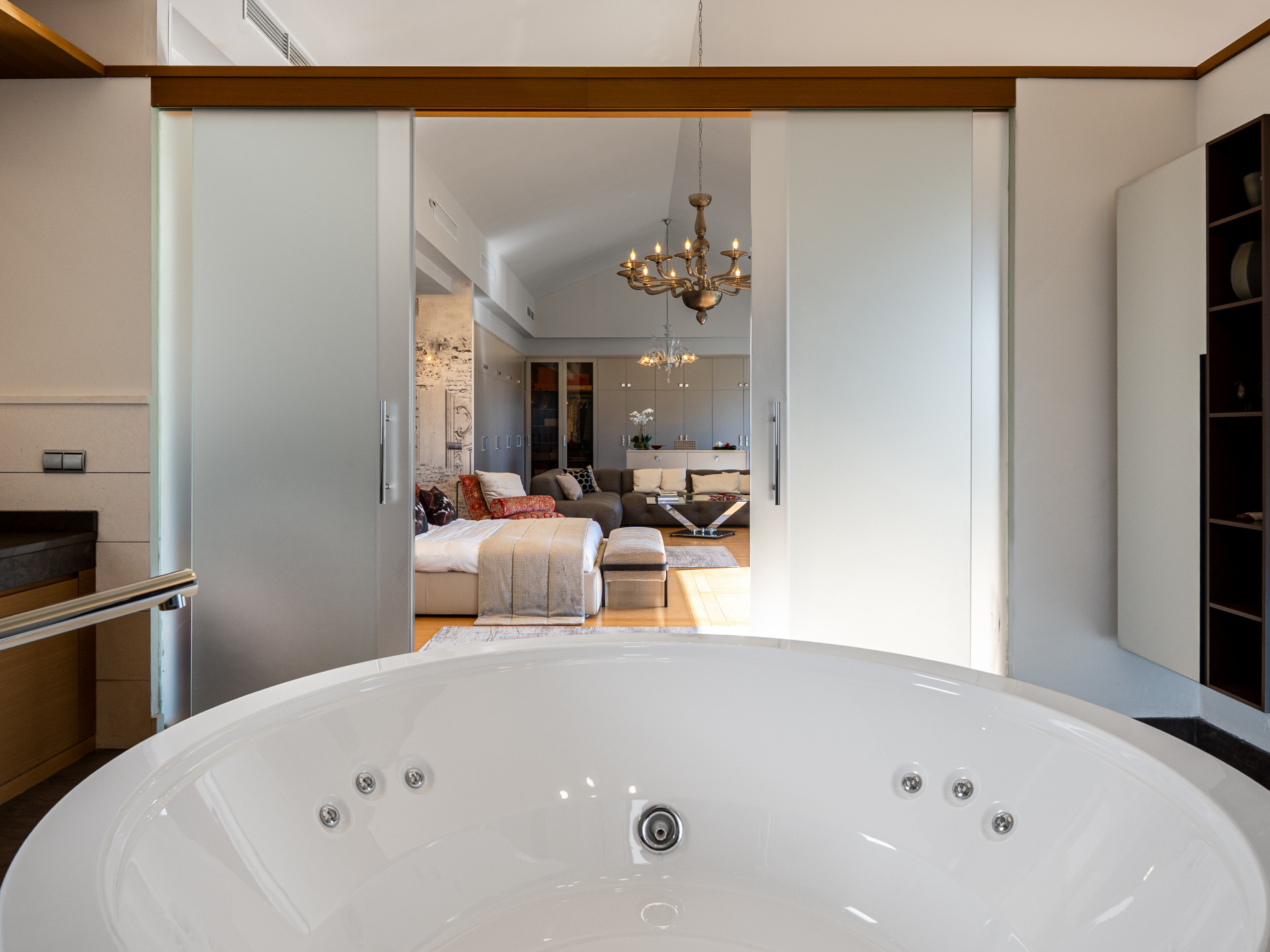 Upstairs, the villa offers generously proportioned bedrooms, each with its own bathroom and walk-in closets, ensuring privacy and comfort for residents and guests alike. The master suite is particularly impressive: a spacious private retreat featuring a lounge area, extensive wardrobe space, and a luxurious oversized bathroom. From the upper floor terrace, a private jacuzzi awaits, offering breathtaking views that stretch from the Mediterranean Sea to the surrounding mountains – an exceptional setting for sunset moments.
