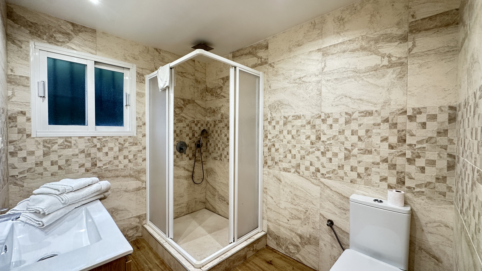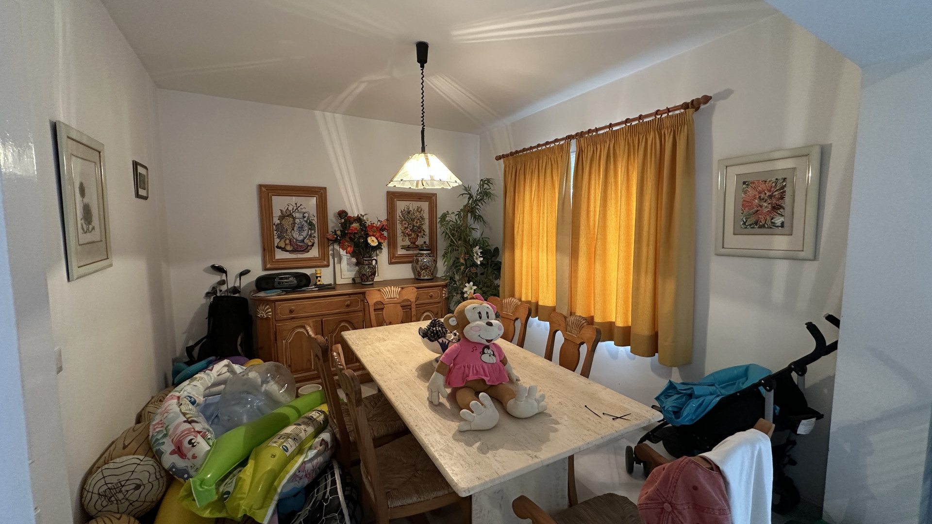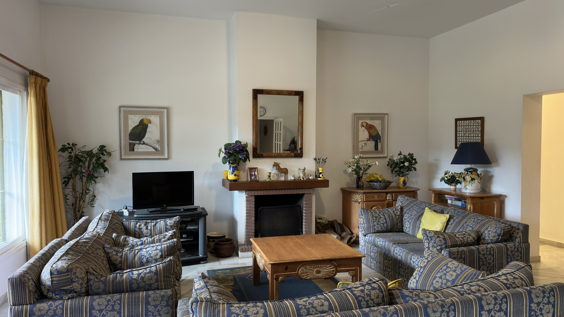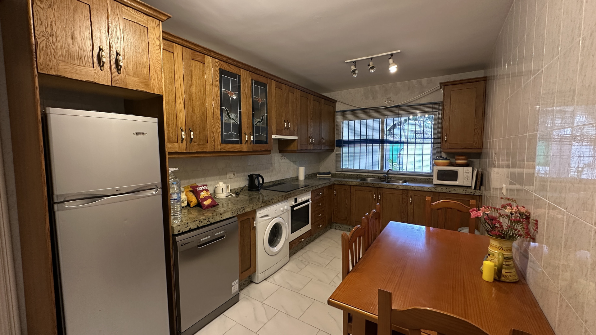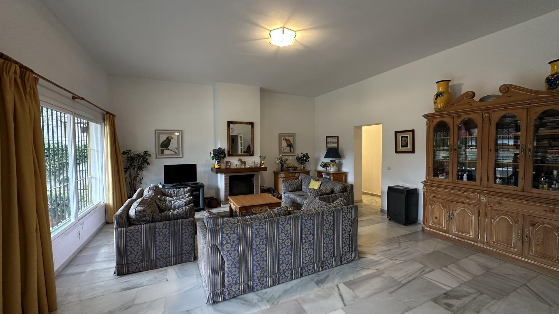 Spanning a spacious built area of 243m² on a generous 782m² plot, the villa is thoughtfully arranged for both family living and entertaining. The home boasts four well-proportioned bedrooms and three bathrooms, including two en-suite facilities, complemented by an additional guest toilet. Living spaces include a welcoming living room with a fireplace, an elegant separate dining room, and a fully fitted and equipped kitchen designed for convenience, alongside a functional laundry room. Quality finishes such as marble floors, fitted wardrobes, and glass doors can be found throughout, while the property is both air-conditioned and offered fully furnished.