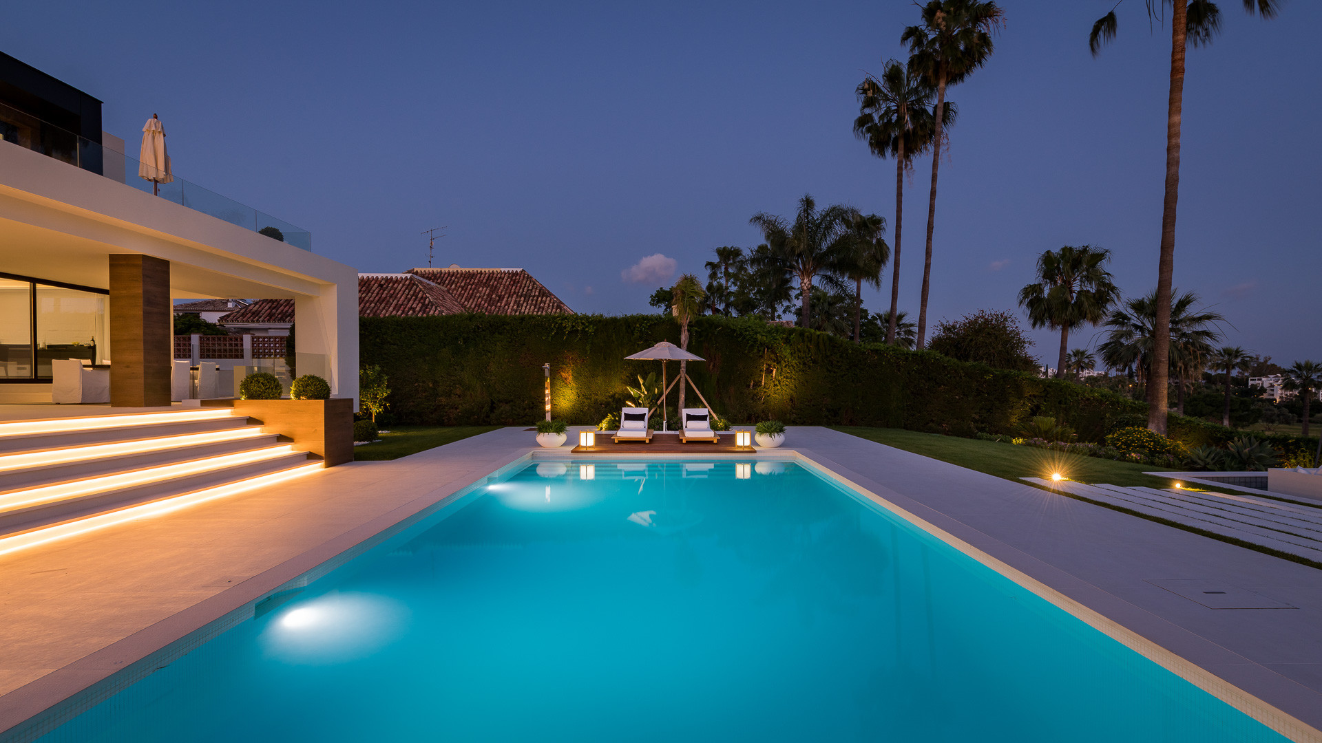 Spectacular villa designed by a well-known award-winning architect located in a privileged setting in the heart of the Golf Valley of Nueva Andalucía, one of the most sought-after residential areas on the Costa del Sol. This southwest-facing villa is distributed over three floors and comprises, on the entrance level: bright hall leading to a huge open-plan living area divided into three seating areas, Italian designer kitchen fully equipped with Gaggenau appliances and dining area. All leads to a spacious porch, the beautiful landscaped gardens with a stunning chill out zone with water features, the extra sized heated pool with outside shower and plenty of space to sunbath and the outside BBQ kitchen – all with stunning views over the the golf course. Upstairs: master bedroom with a huge elegant wardrobe, en-suite bathroom and access to the terrace to enjoy the views, even from the bathtub; further suite; 2 bedrooms sharing a bathroom. All bedrooms have spacious built-in oak wardrobes. Lower level: 2 more bedrooms; laundry room; wine cellar; gym and a home-cinema. Built to the highest specifications and finishes, including bathrooms with Dornbracht fittings to mention a few. Quietly located, undisturbed, on an elevated plot on the golf course. Situated only a few minutes’ drive to the renowned Aloha international college and Aloha, with its rich selection of restaurants, bars and amenities. Only 5 minutes’ drive to Aloha Golf, Las Brisas Golf, La Quinta Golf, Magna Marbella Golf, and a wide selection of tennis and paddle tennis courts. Only 10 minutes’ drive to Puerto Banús, the beach and Marbella’s Golden Mile.