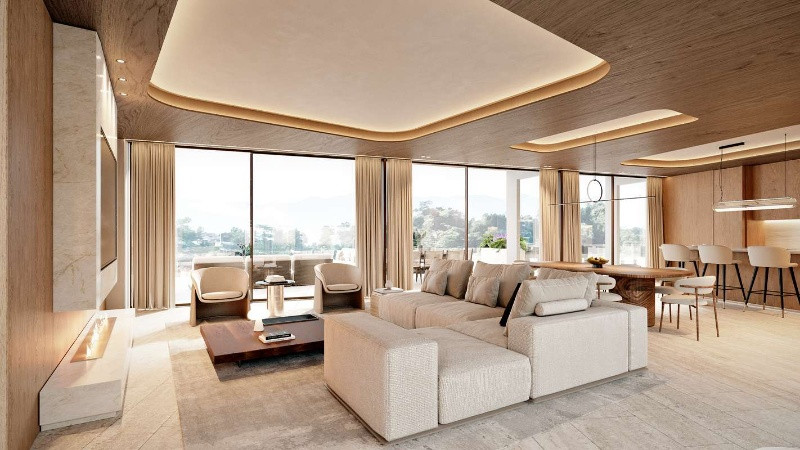 Large sliding glass doors create a seamless indoor-outdoor connection, leading directly to a panoramic terrace and the infinity pool.