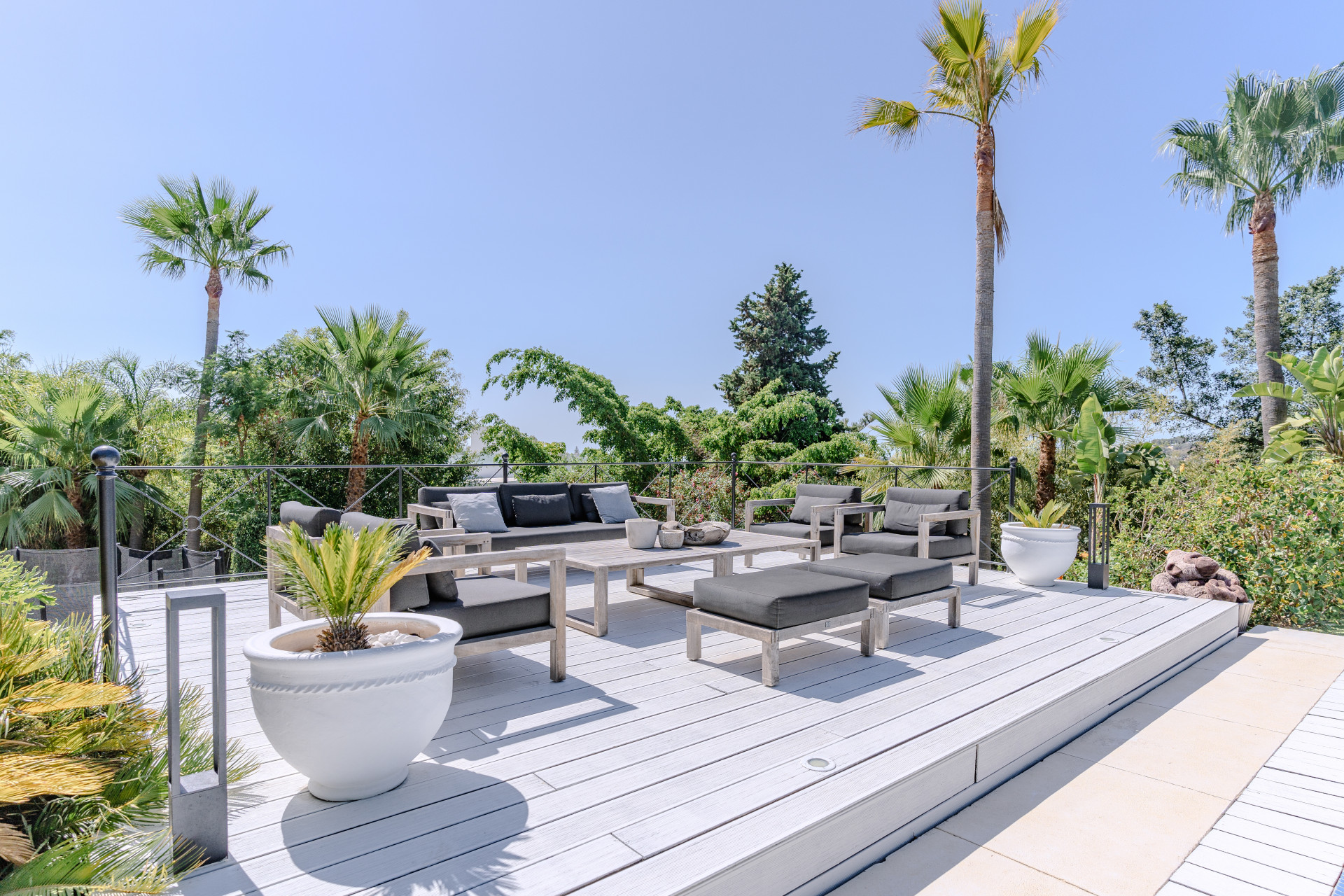 Step outside and the villa truly begins to shine. The landscaped gardens feel like a private oasis, filled with mature palms, lush greenery, and multiple terraces designed for relaxing or entertaining. At the center lies a sparkling private swimming pool, surrounded by elegant lounge areas and sun-drenched spaces perfect for soaking in Marbella’s year-round sunshine. Elevated viewpoints across the property reveal beautiful open views of the surrounding golf valley and mountains, a daily reminder of the exceptional setting.