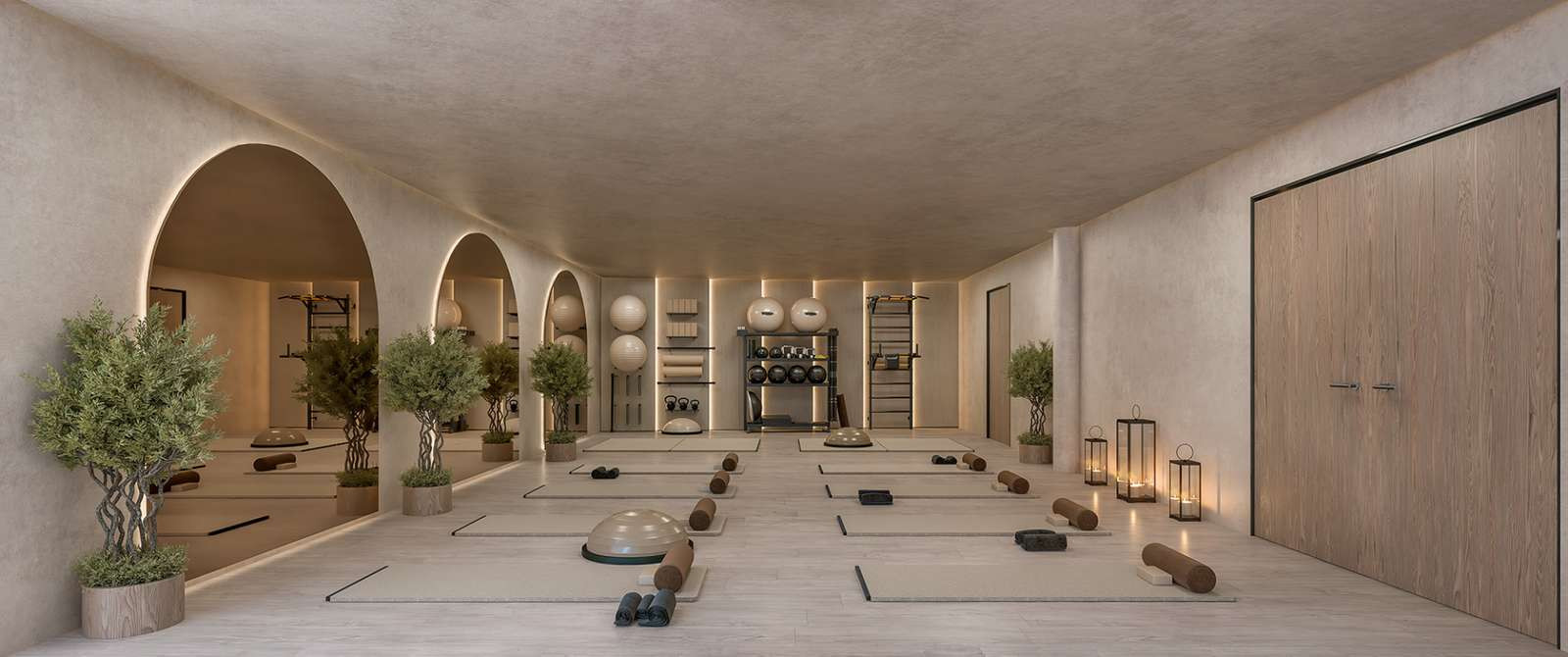 These include a wellness area with sauna and steam room, co-working space, concierge service, and a beach-style swimming pool surrounded by Mediterranean gardens.