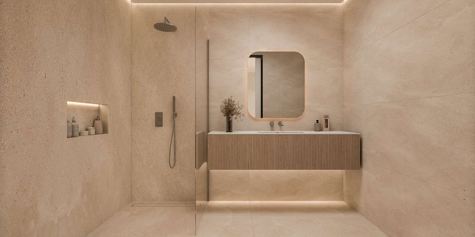Bathrooms include smart LED mirrors, temperature-controlled showers, and intelligent toilets, reinforcing the contemporary luxury concept of the development.