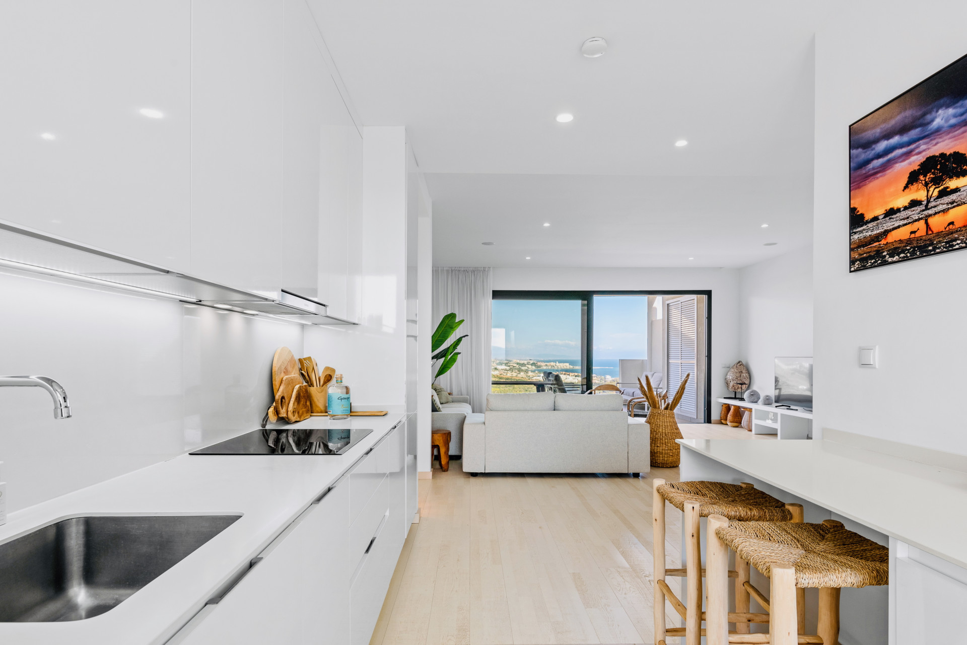 Step into a bright, open-plan living area with parquet flooring, tastefully decorated and opening onto a spacious terrace with breathtaking panoramic views of the Sea, mountains and countryside.