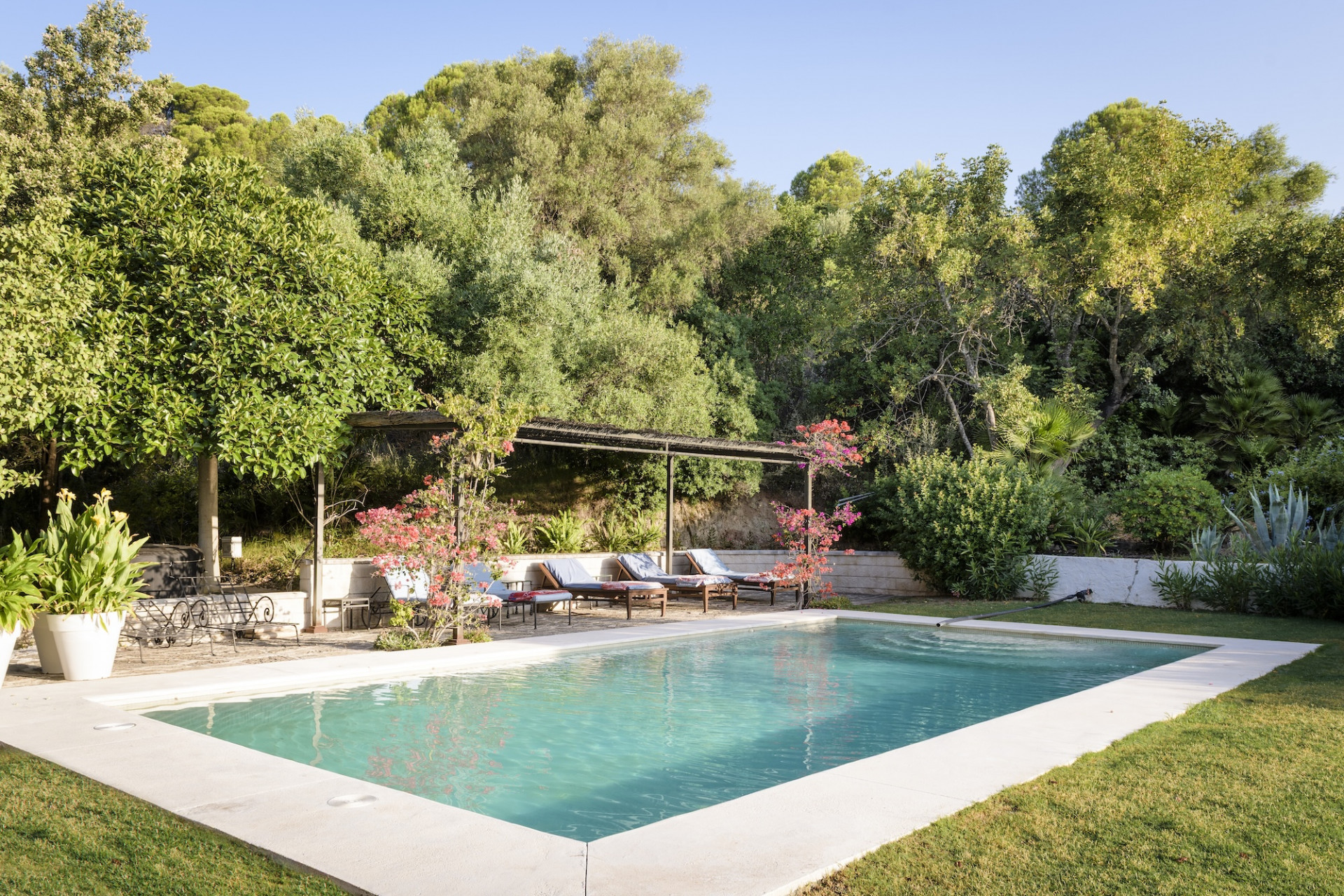 Landscaped gardens surround a swimming pool framed by sun terraces and shaded pergola, inviting leisurely enjoyment of the Andalusian climate. Sustainable features include solar-powered underfloor heating, a private well and photovoltaic energy achieving an A-rated EPC.