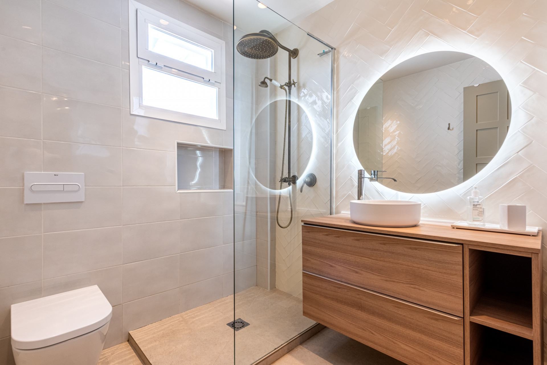 The home is distributed across three levels. On the main floor, you’ll find a bright and spacious open-plan living area with a modern kitchen, seamlessly leading out to a sun-filled terrace. From here, as well as throughout the home, you can enjoy stunning sea views. This level also includes a guest toilet.