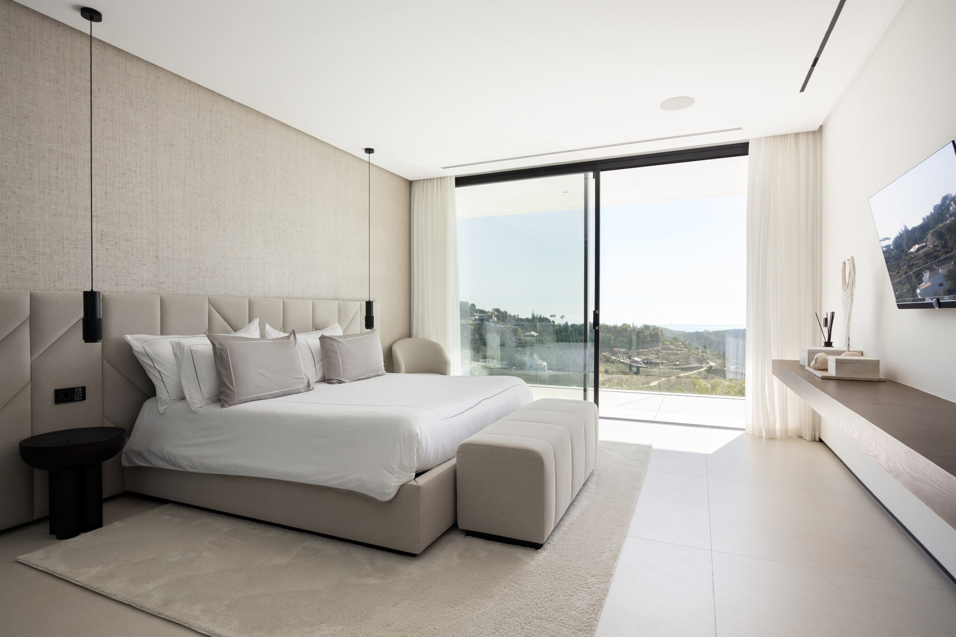 Thoughtfully designed to embrace its surroundings, the villa centers around a light-filled open-plan living space where panoramic mountain and sea views take focus. A striking entrance leads into a spectacular double-height living area, seamlessly connected to an elegant lounge, formal dining space, and a sleek designer kitchen. A beautifully appointed guest suite completes this level. Expansive floor-to-ceiling windows open onto generous terraces and a stunning infinity pool, creating a seamless indoor-outdoor flow and allowing the views to be enjoyed from every angle.