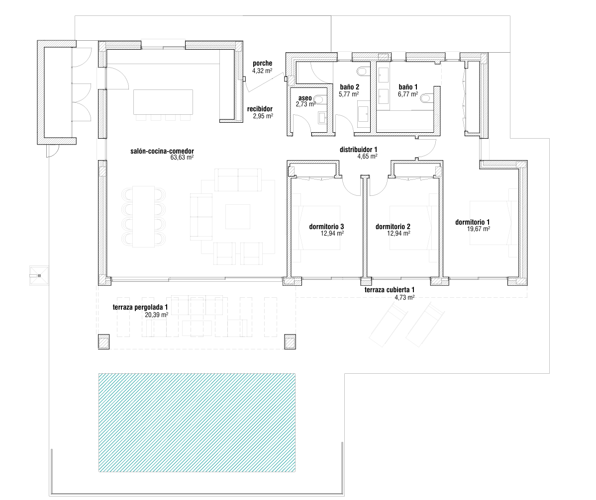 Featuring 3 spacious bedrooms and 3 elegant bathrooms, the villa showcases a bright open-plan design with a fully fitted kitchen, dining area, and large living space. Soaring ceilings and floor-to-ceiling windows fill the home with natural light, seamlessly connecting the interior to its private garden, pool, and stunning Mediterranean surroundings.