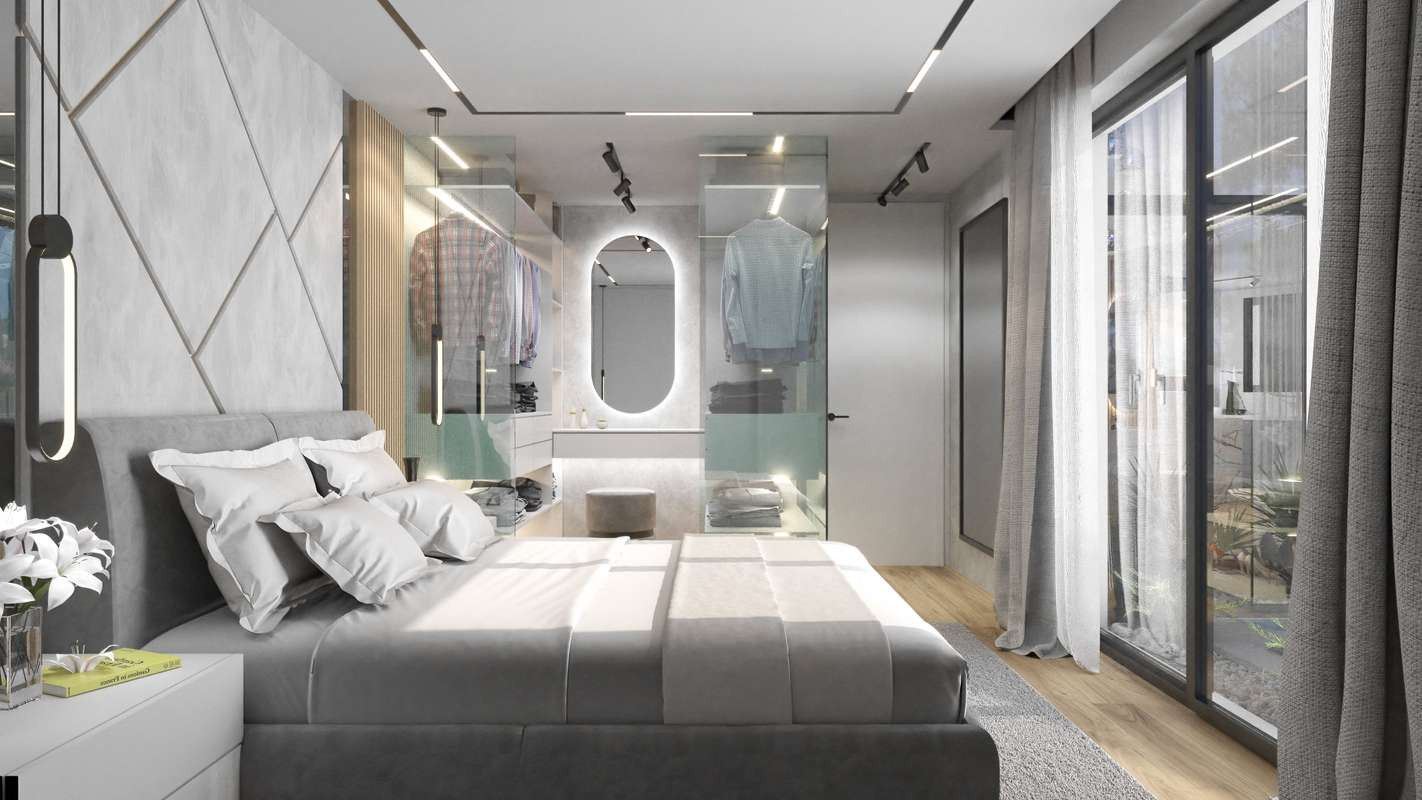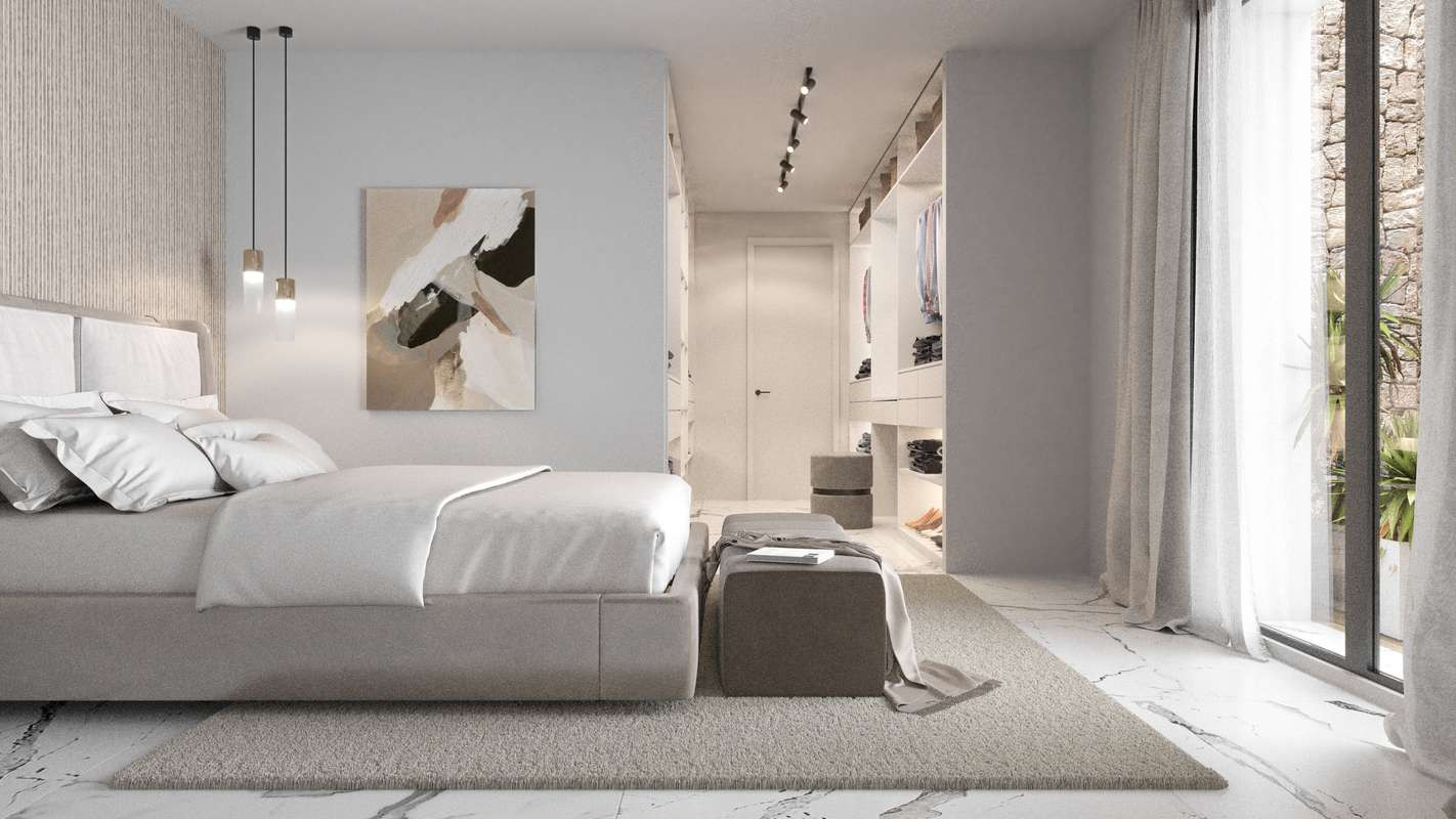 Inside, the villa continues to impress with refined interiors. The master suite includes a spacious walk-in closet, while the open-plan living room connects seamlessly with the dining area and modern kitchen. A cozy fireplace enhances the ambiance, and large sliding glass doors open fully onto the terrace, creating a fluid indoor-outdoor lifestyle.