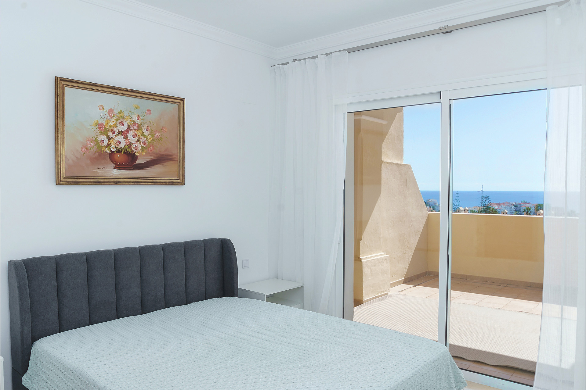 The apartment comprises two well-appointed bedrooms, including a luxurious master with en-suite bathroom, and a further high-quality bathroom. Modern features such as marble floors, underfloor heating in bathrooms, air conditioning, and double glazing ensure comfort and elegance at every turn. The kitchen is both fully fitted and equipped, offering a functional yet stylish space for culinary pursuits, while the spacious living room enjoys natural light and direct terrace access—perfect for entertaining or relaxing admiring the panoramic vista.