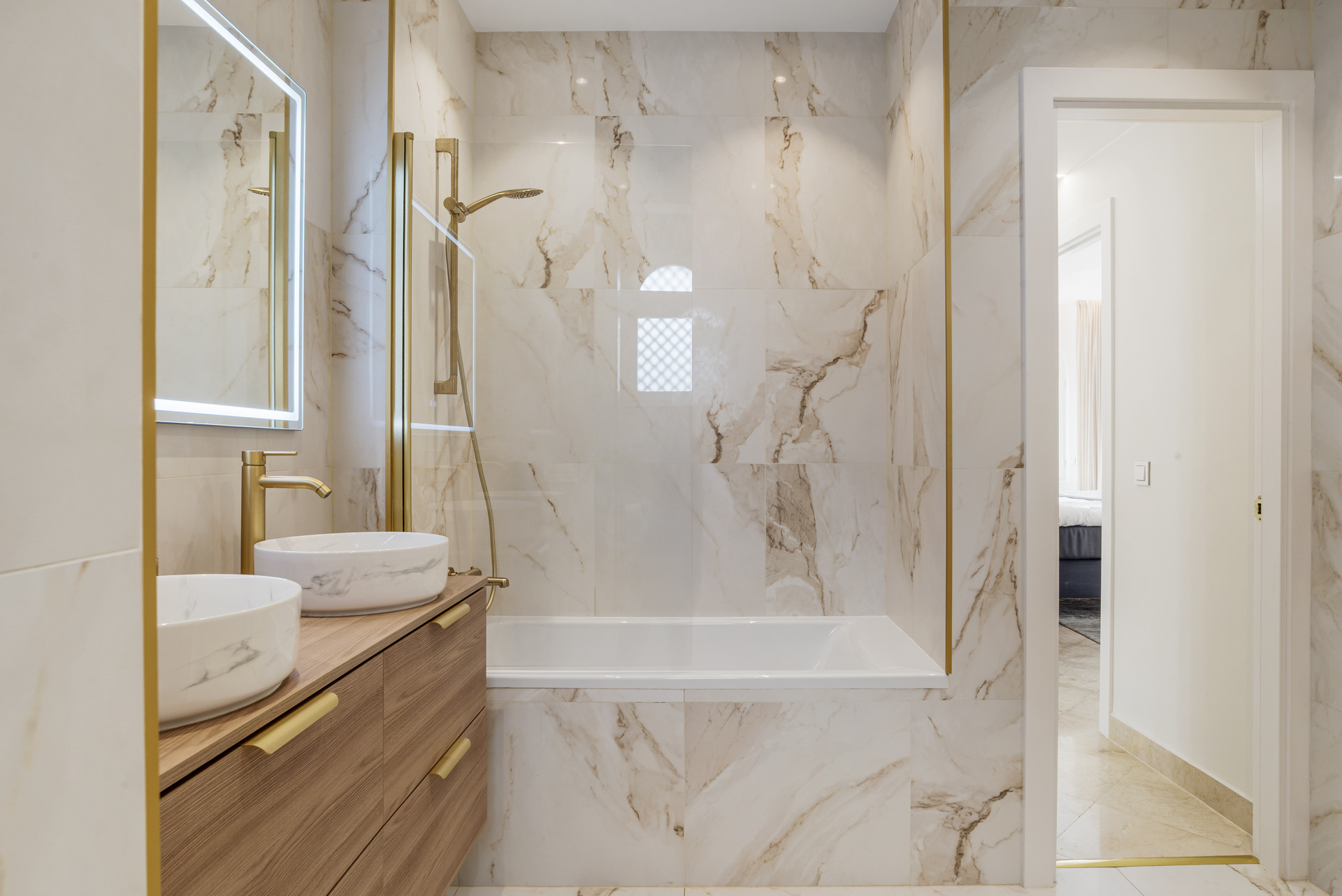 Upon entering the property, one is greeted by an open-plan kitchen that seamlessly integrates with the living and dining areas, creating a harmonious flow throughout the entrance level. The kitchen is fully fitted and equipped to the highest standards, ensuring a delightful culinary experience. The master bedroom, along with another bedroom featuring an en-suite bathroom, is located on this level, offering comfort and privacy. The apartment is fully furnished, with marble floors adding a touch of opulence to the interior.