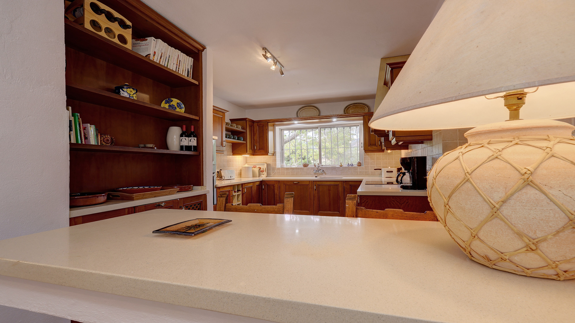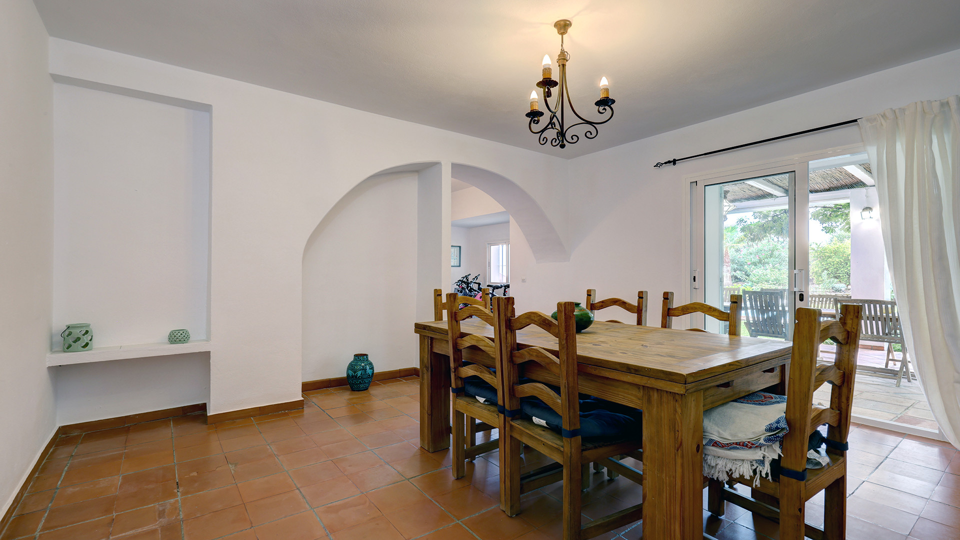 The rustic-style country home offers 3 spacious double bedrooms and 2 bathrooms. The open-plan kitchen, complete with a breakfast bar, leads to a utility room located at the back of the kitchen for added convenience. The kitchen flows seamlessly into the living room, which features a traditional open fireplace. Air-conditioning (hot and cold) and ceiling fans ensure comfort throughout the home. Off the living room is a separate dining room which provides a formal space for meals, and both the living and dining rooms open out onto a covered terrace that leads out to the garden and pool area – perfect for easy indoor-outdoor living.