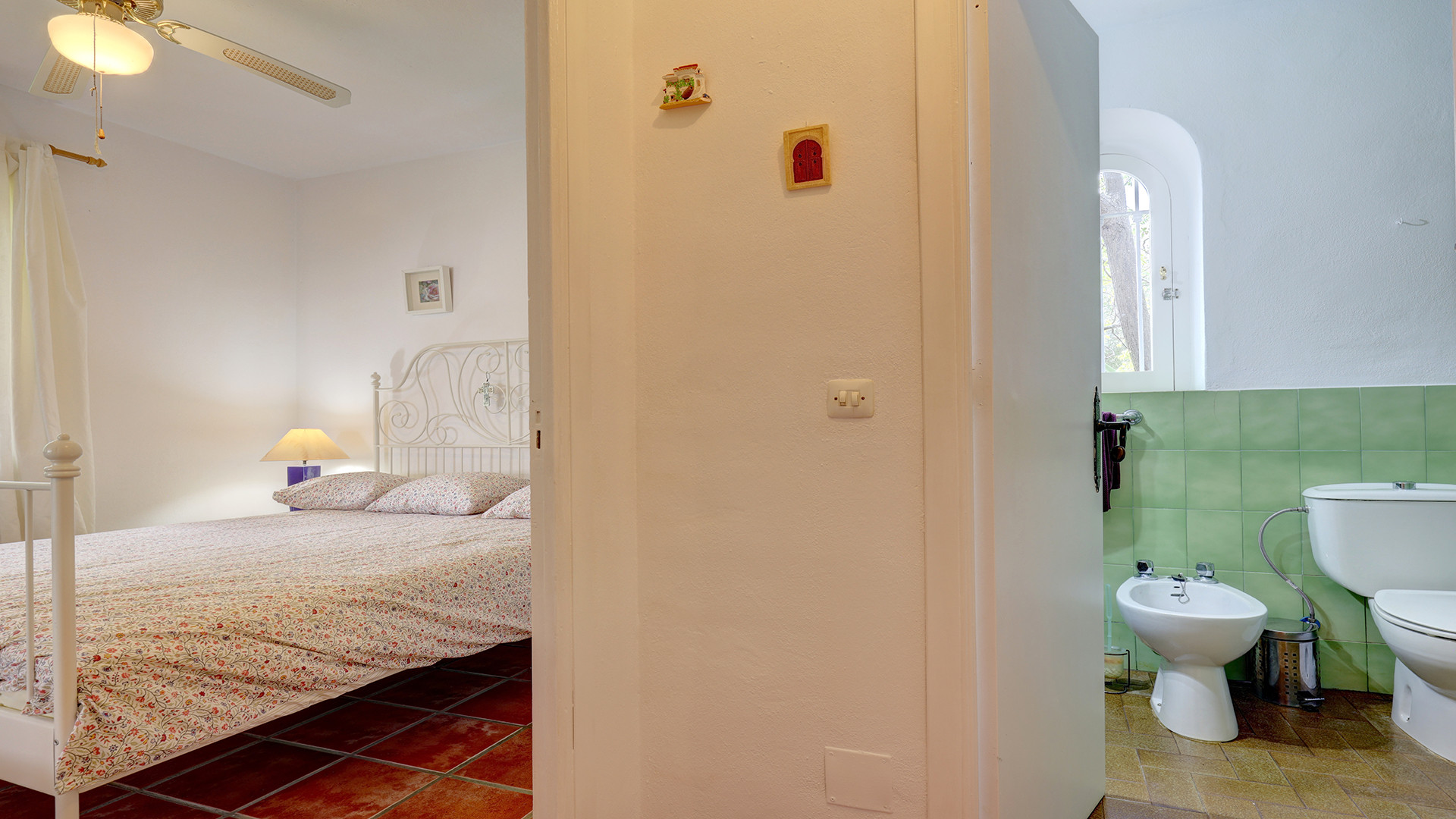 The home is divided into two wings. The first wing includes two generously sized double bedrooms, with the first bedroom offering direct access to the back garden and orchard. The spacious main bedroom features lovely country views, fitted wardrobes, and an ensuite bathroom with double sinks. The second wing houses the third bedroom and bathroom, with direct access to the terrace and garden. Fans and air-conditioning units are present in all bedrooms for additional comfort, and a large storage cupboard offers ample space for storage.