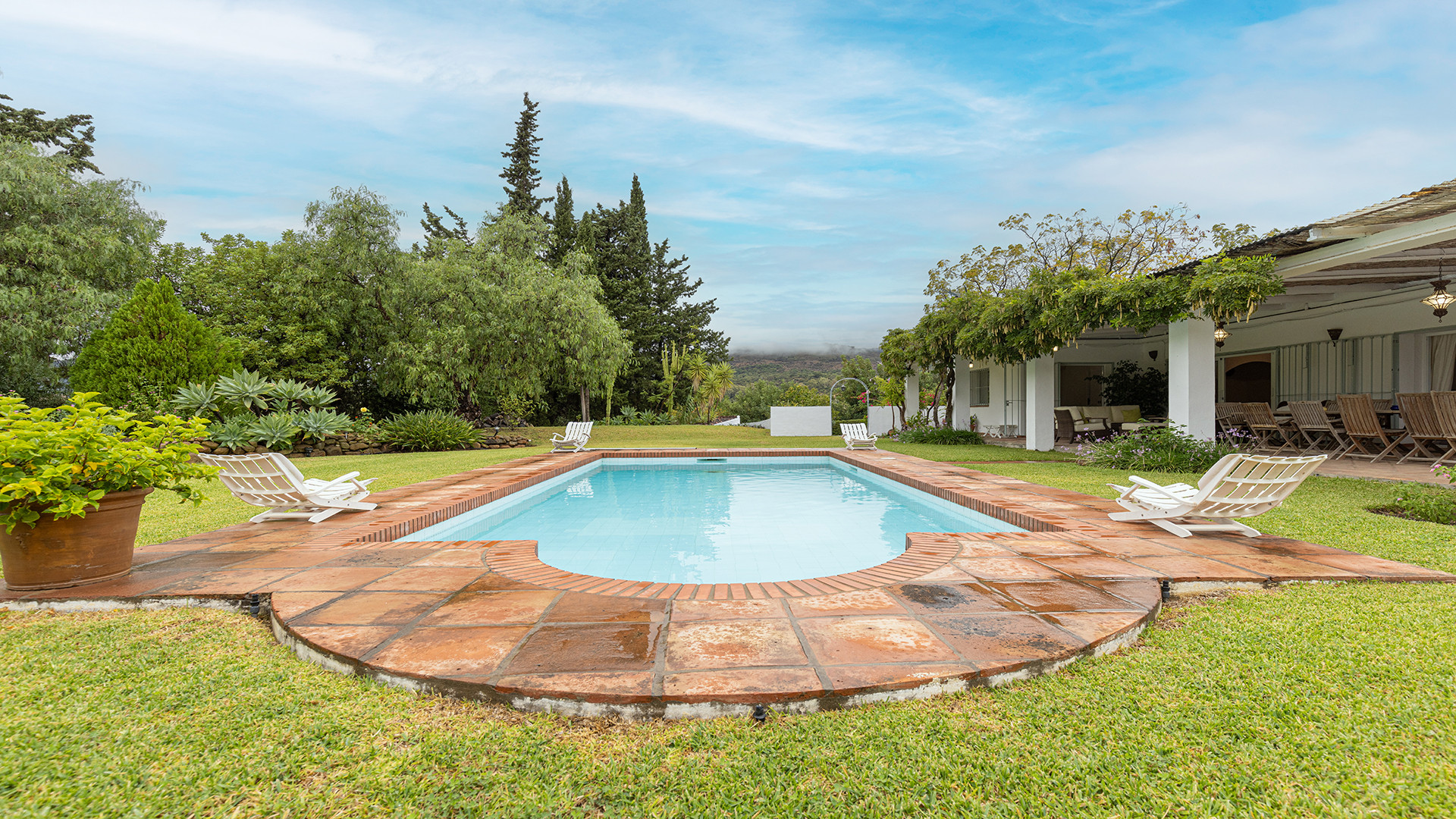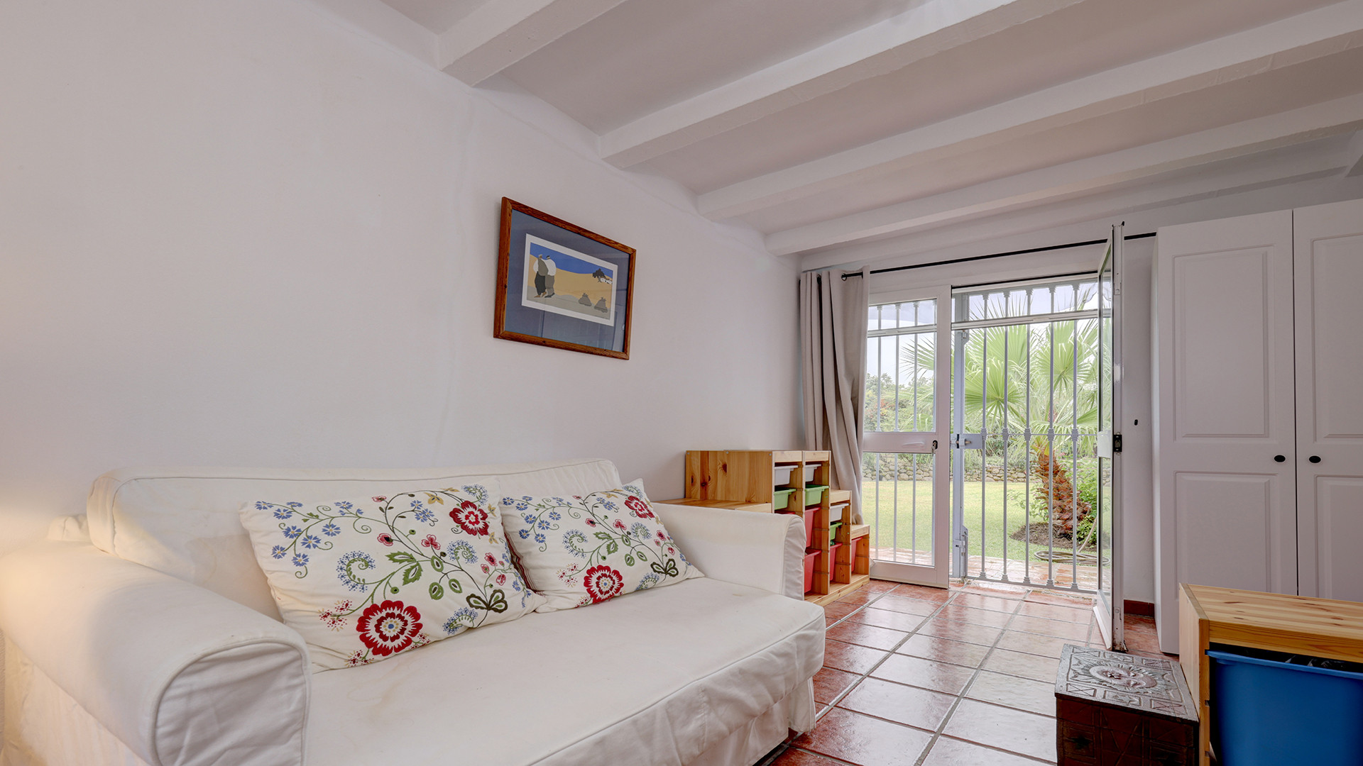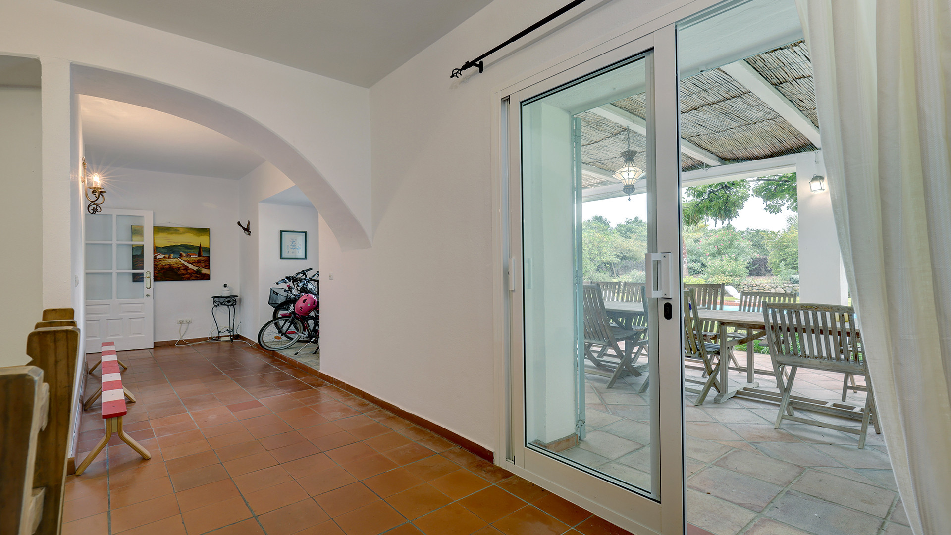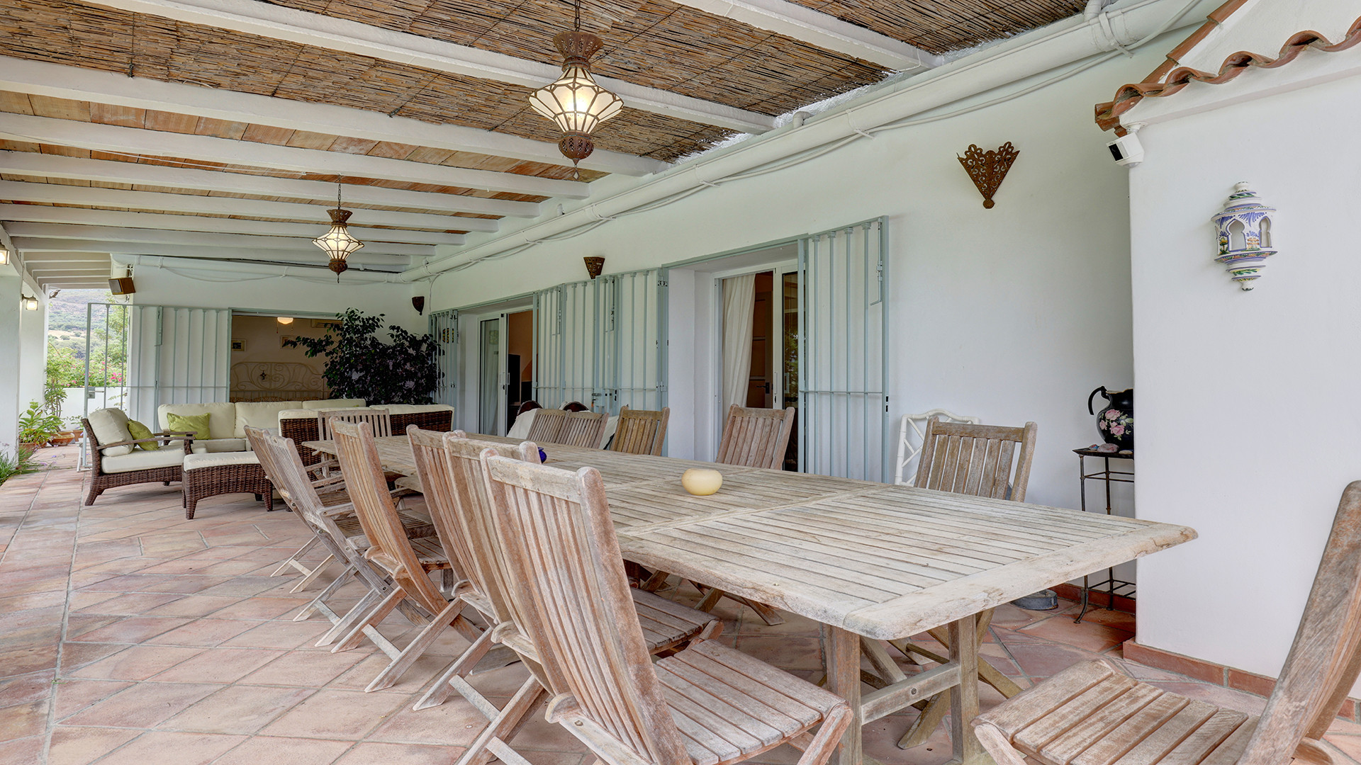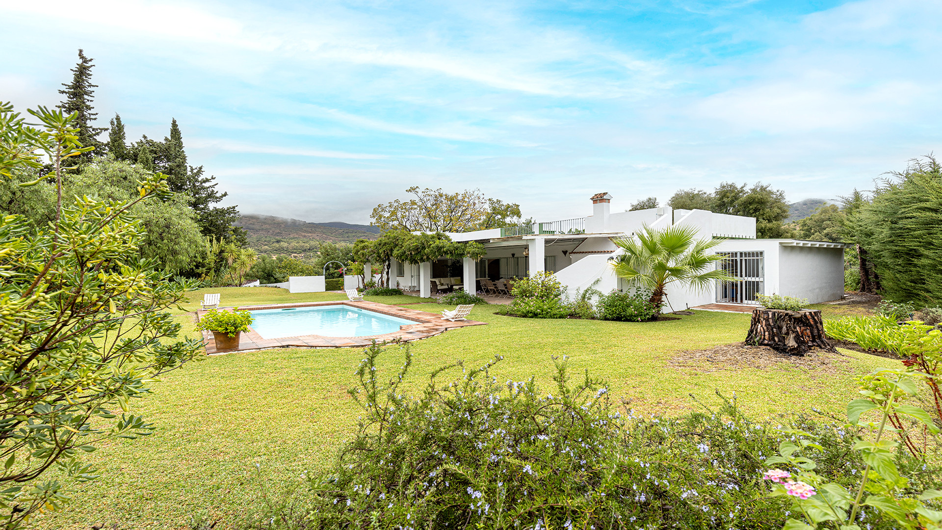 The covered terrace has a large dining area – ideal for al fresco dining and a comfortable relax area with sofas – sit back and enjoy the privacy and peacefulness of this setting. The terrace follows our to the private pool which is set within a beautiful lawn. The surrounding land is stunning filled with fruit trees such as lemon, grapefruit, orange, and avocado. A BBQ area adds to the outdoor entertainment options. Stairs from the covered terrace lead to a solarium terrace, providing an additional outdoor space for relaxing in the peaceful surroundings.