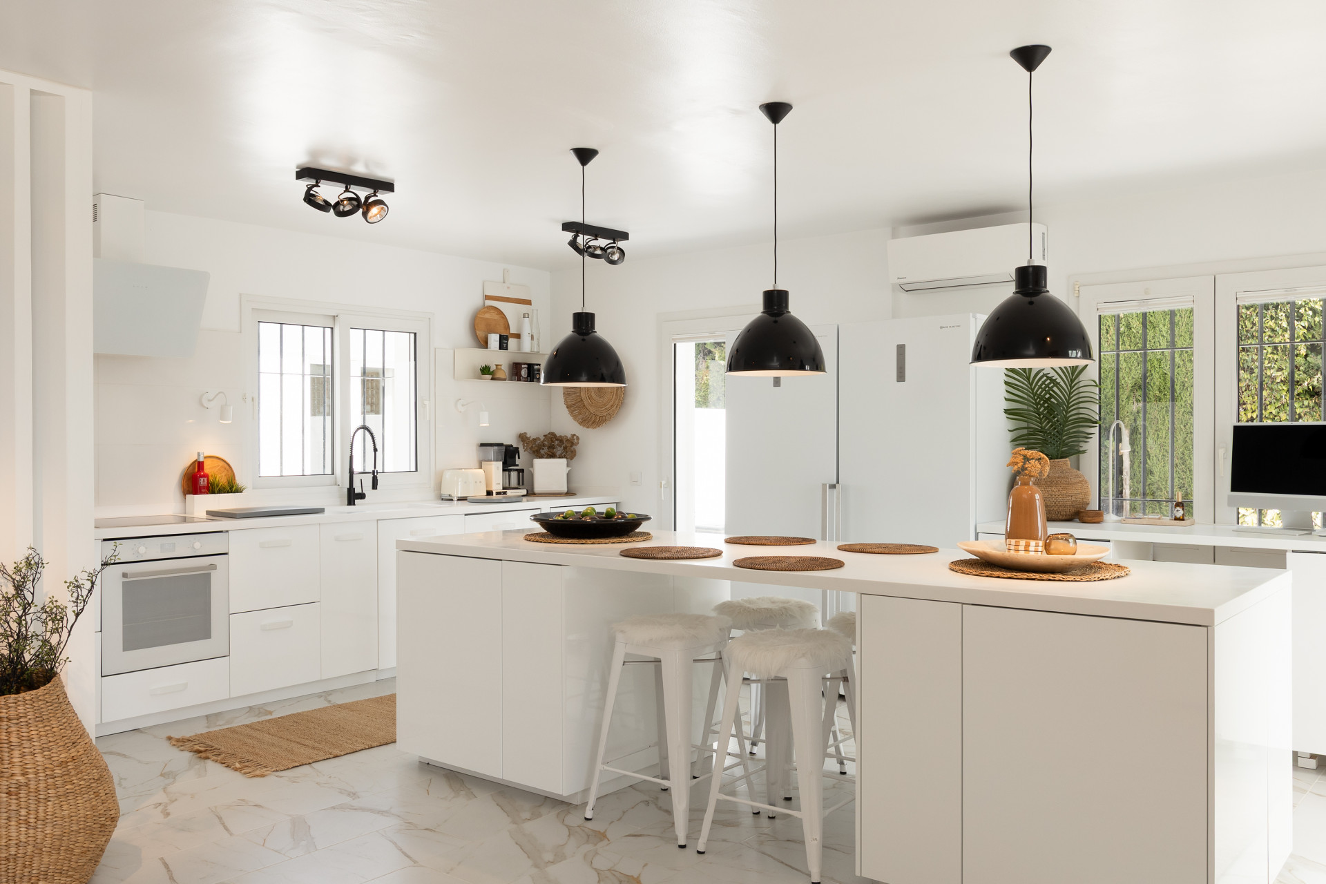 A beautifully renovated Andalusian family home with a calm, understated elegance, Casa Serena enjoys open southerly sea views from the moment you step through the entrance. The main living level is designed for effortless indoor-outdoor living, with an open-plan kitchen, dining, and lounge area flowing directly onto a generous covered terrace. From here, the views stretch across the pool, the golf course, and out to the Mediterranean, creating an ideal setting for both quiet mornings and relaxed entertaining.